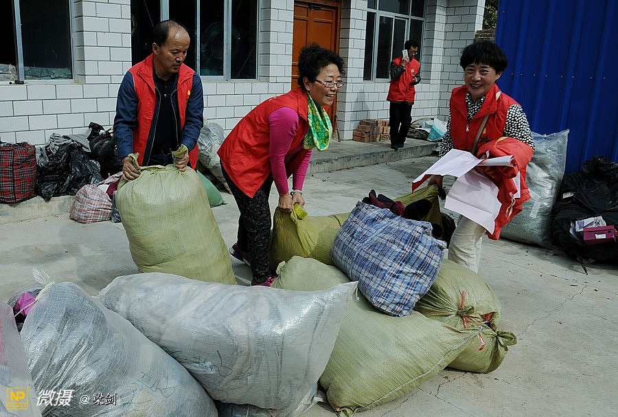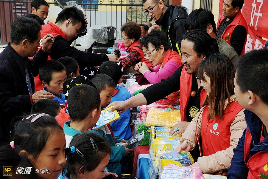 之后,志愿者开始给师生发送物资,在场的家长和孩子们感觉过年一样热闹,因为该村很少有外人进入