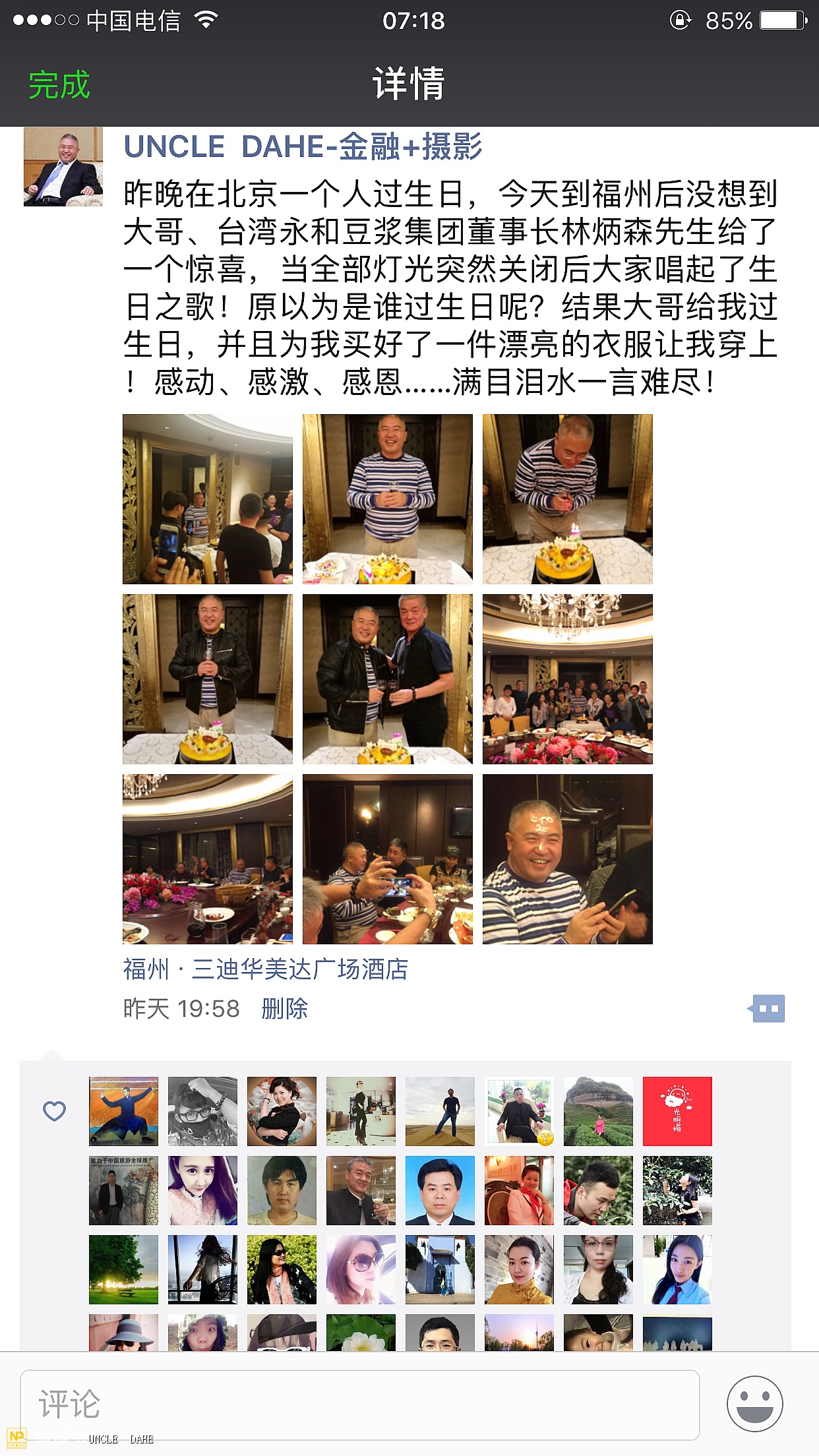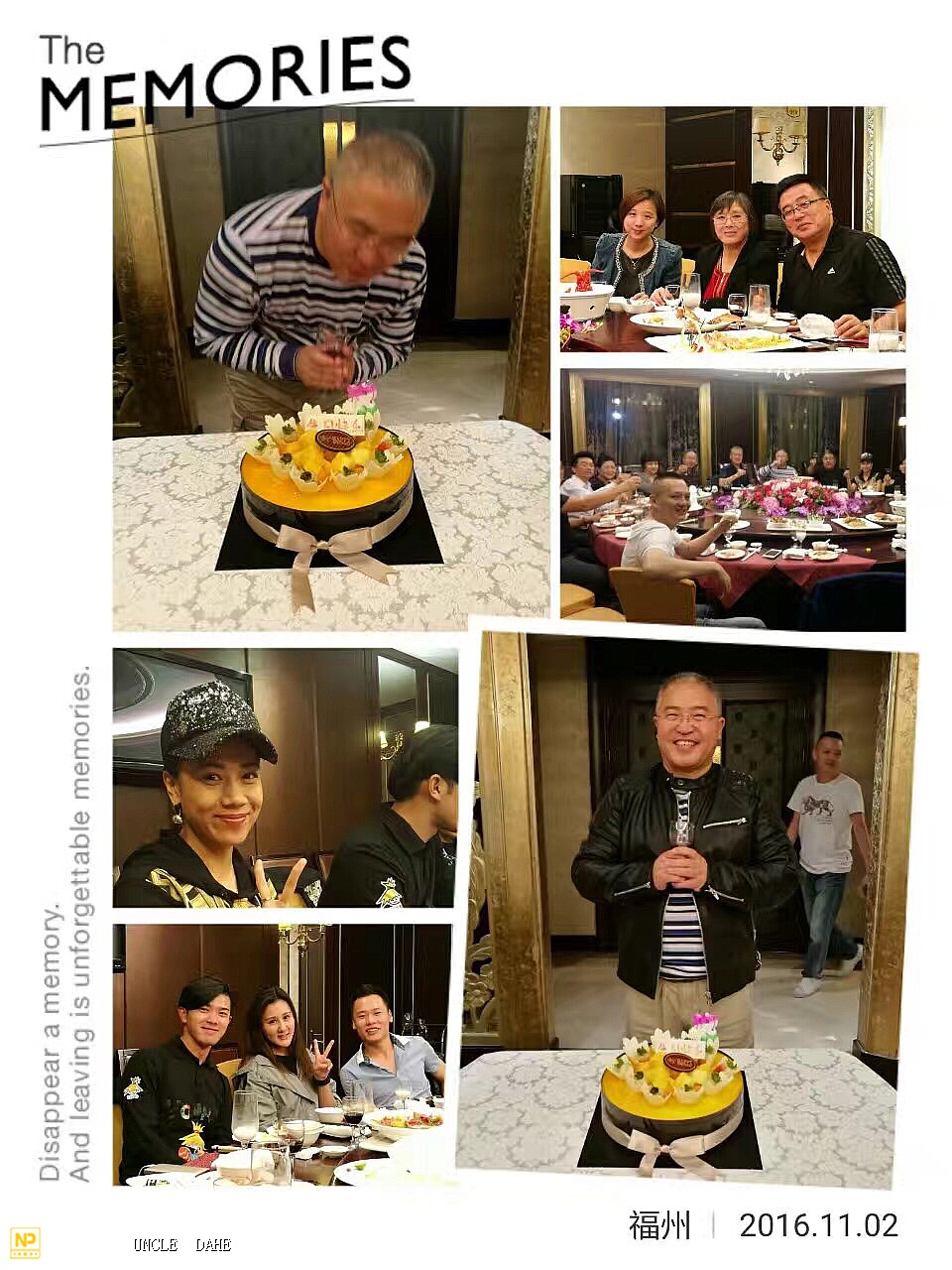 感动中,我这样记录了11月2日:昨晚在北京一个人过生日,今天到福州后没想到大哥、台湾永和豆浆集团董事长林炳森先生给了一个惊喜,当全部灯光突然关闭后大家唱起了生日之歌!原以为是谁过生日呢?结果大哥给我过生日,并且为我买好了一件漂亮的衣服让我穿上!感动、感激、感恩……满目泪水一言难尽!