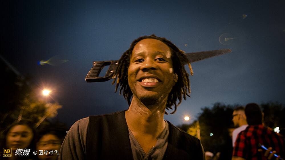 除了好莱坞题材,各种搞怪创意十足。看,这位游客的头上,竟然插了一把“钢锯”?