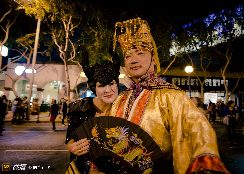 洛杉矶是美国最大的华侨定居地之一,这活动,华人当然也不会缺场,这是一对华人的装扮,看着也够慎的。