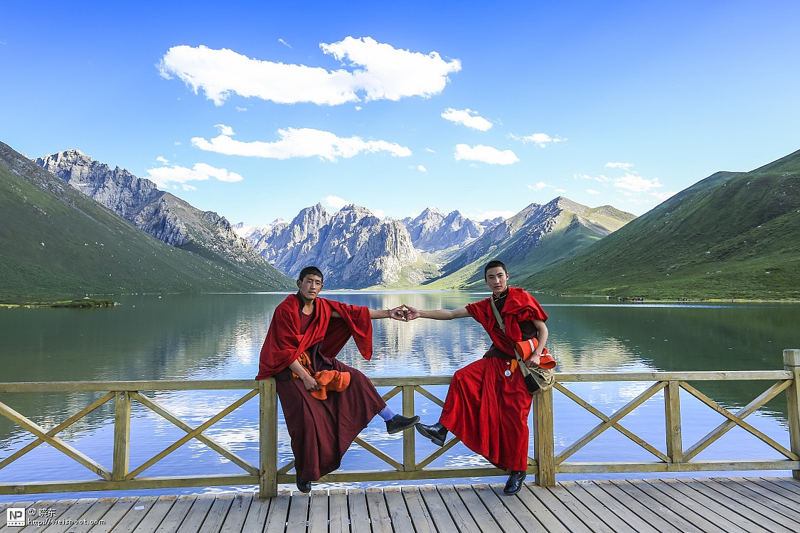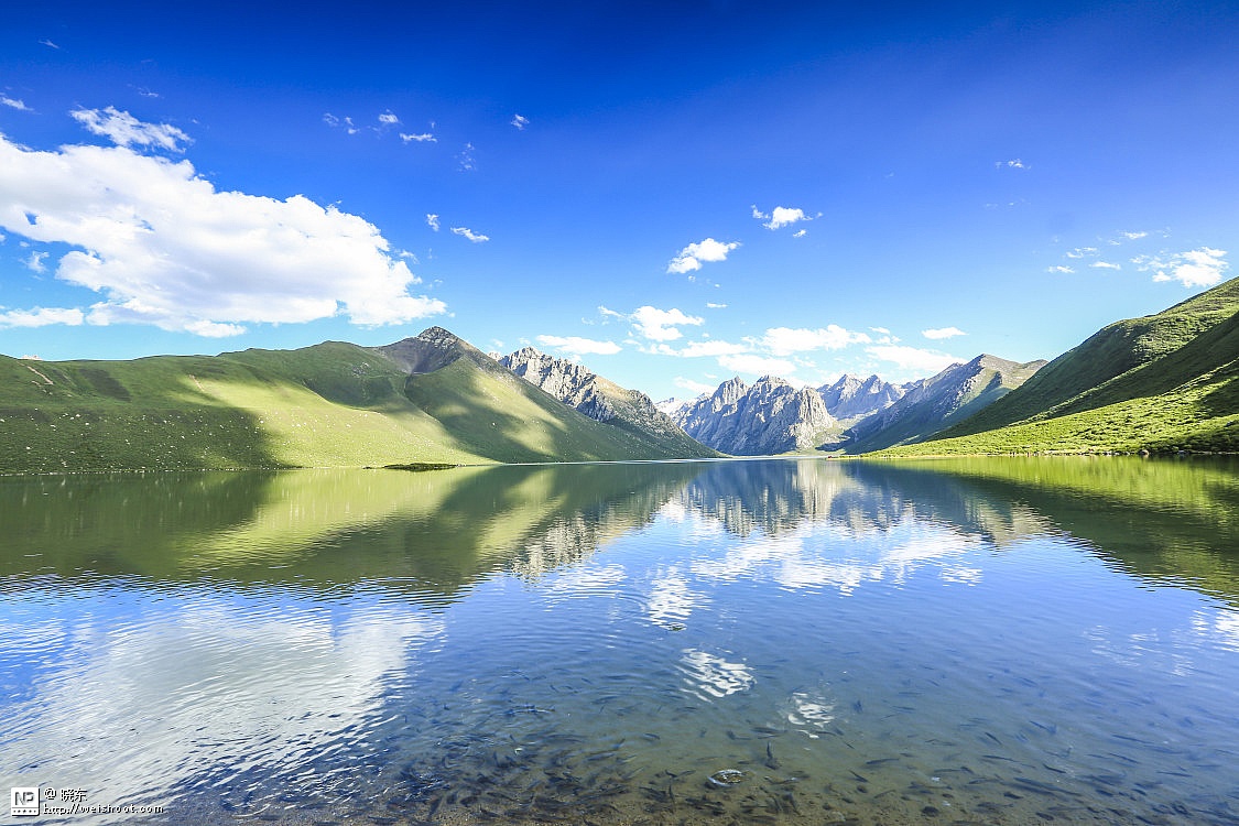 年宝玉则的仙女湖,山峰余雪犹存,水中神鱼漫游,光影下的山峦变幻无穷,让人心旷神怡。