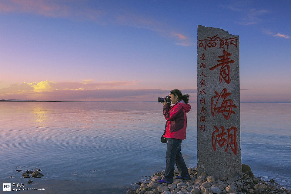 青海湖的晚霞虽然羞涩,却也令影人着迷。