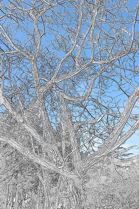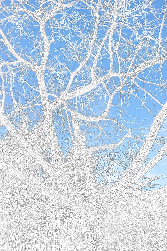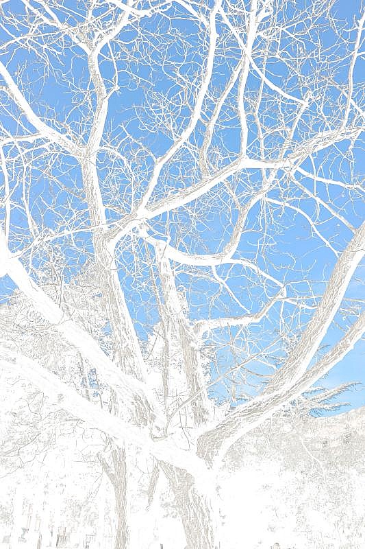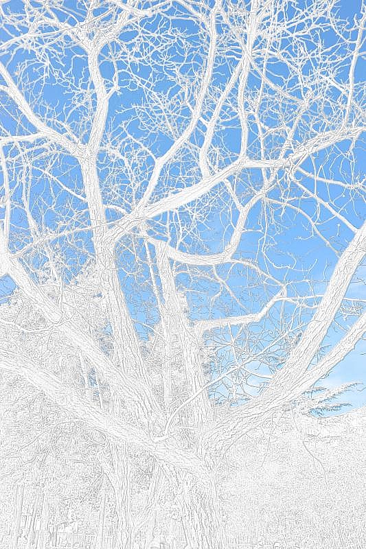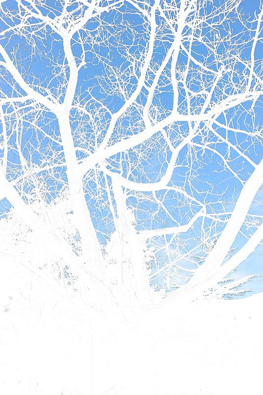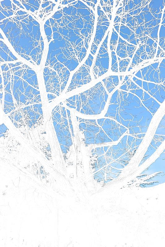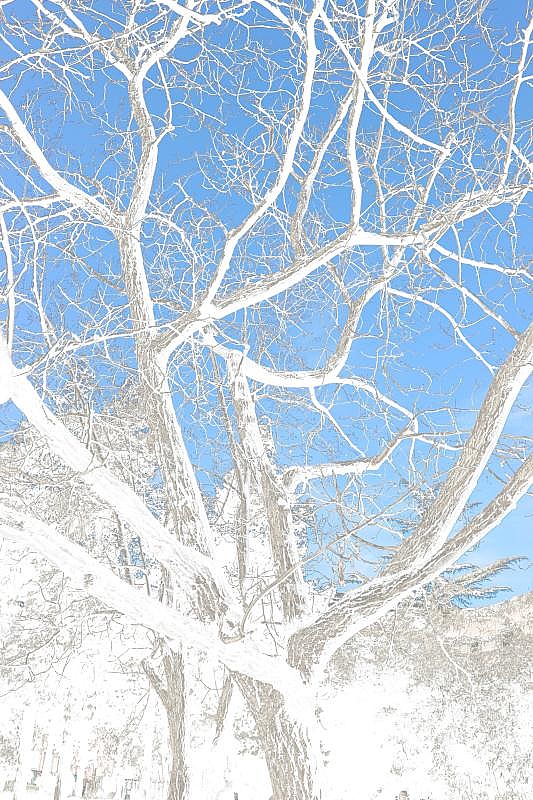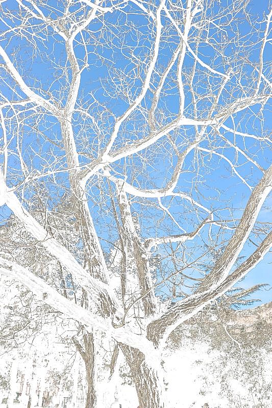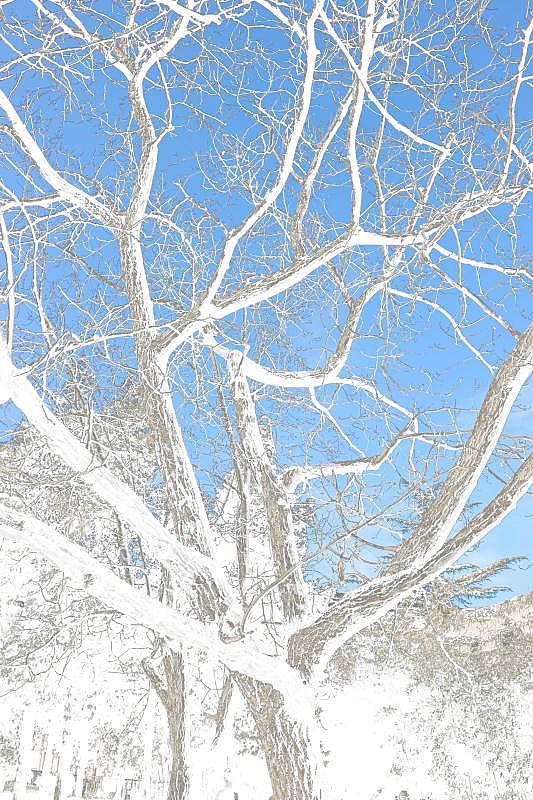 雪韵墨影?雪韵墨影在心中一种情趣浓浓很有内涵的一张照片就像老古董冷眼看似乎很平庸看不出骨子里血脉在涌动?画面杂乱无序那里的意境你不懂每一种色彩都不是单一的直通有爱的心里眼睛能看到深刻内容所有的美与不美都在欣赏或漠视中?淡化杂乱无序的背景,剔除暗影,就像画家的眼睛,看到的是需要的主题,速写一样抽筋拔骨,突出主题。让蓝天的背景再清淡一些,让树干树枝像淡墨一样,就出现了画家无法用色的雪景,就是如何选择颜色解决的问题。雪韵的意味渐渐出现,墨影飘逸出现。主题渐渐明朗,衬托出雪韵抹去墨痕,只要蓝天,彰显出大雪过后满树白。雪渐渐融化,树渐渐有色彩了暗影逐渐显现,雪在消融直接用速写的手法,把照片翻版出来,任何画家也无法如此,有层次,有条不紊的把所有的枝干写明白的。