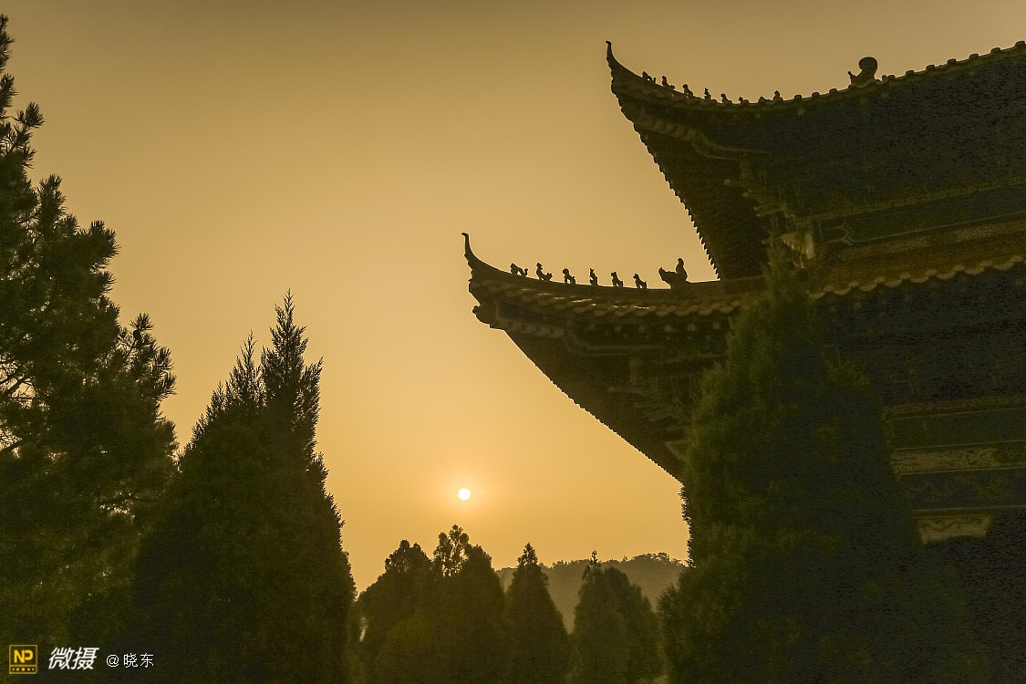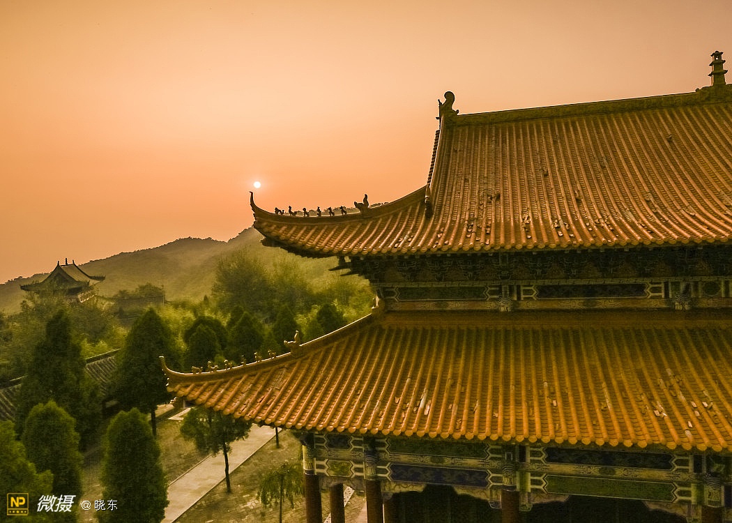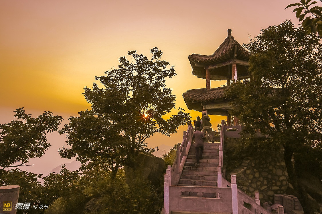 日出五朵峰,庙宇映金光