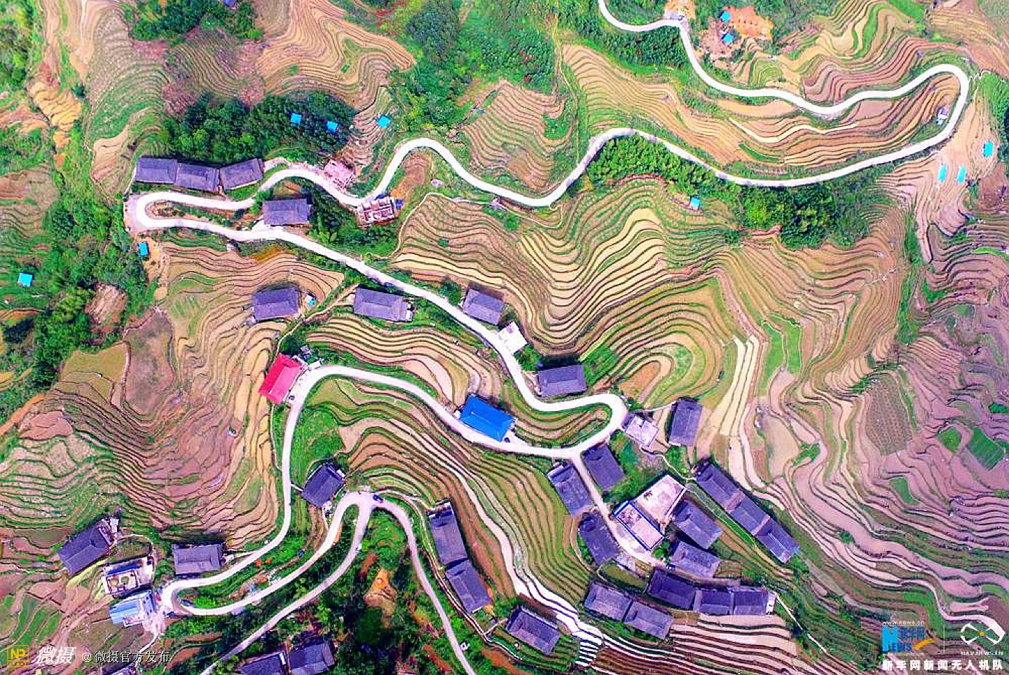 航拍广西桂林市龙胜各族自治县泗水乡细门村孟山公路。新华网发 潘志祥摄