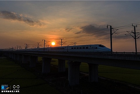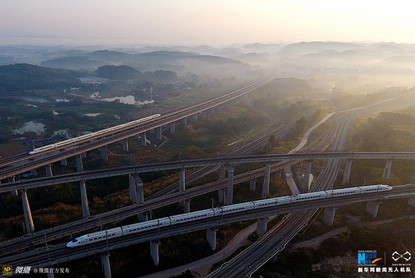 航拍动车行驶在广西南宁市屯里特大桥上。新华社记者 黄孝邦摄