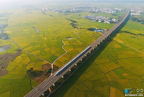 航拍一列动车在广西南宁市宾阳县境内行驶。新华社记者 黄孝邦摄
