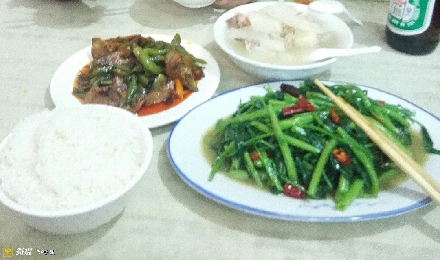 标准伙食,川菜尖椒炒肉、青菜和白米饭。😜
