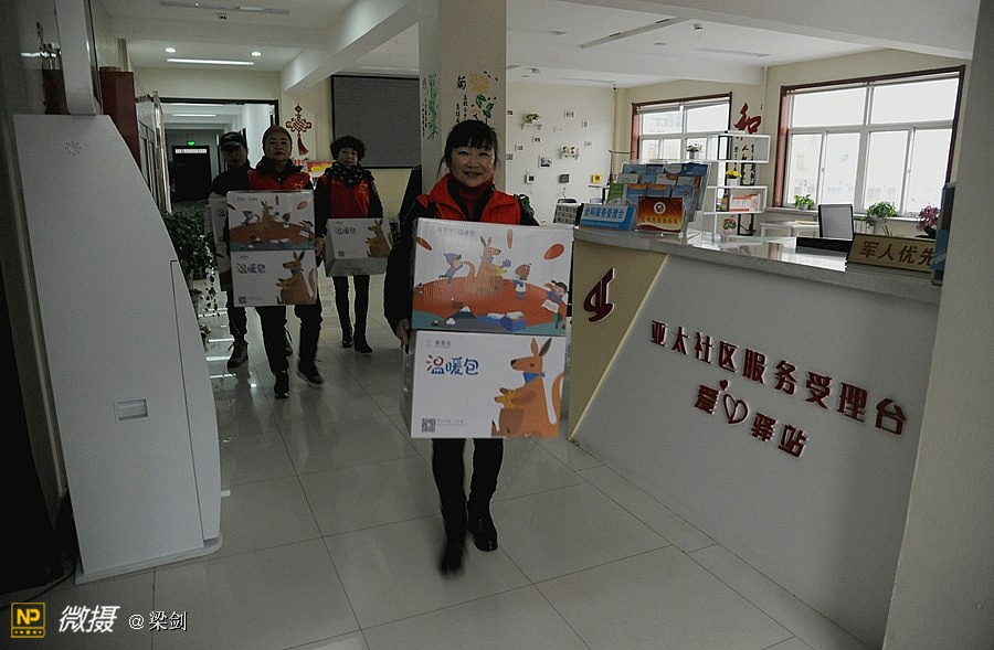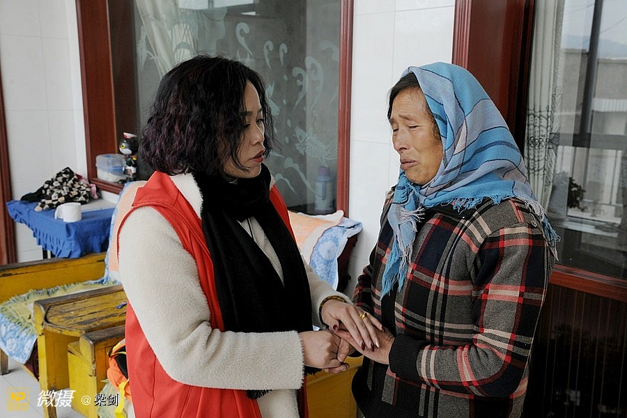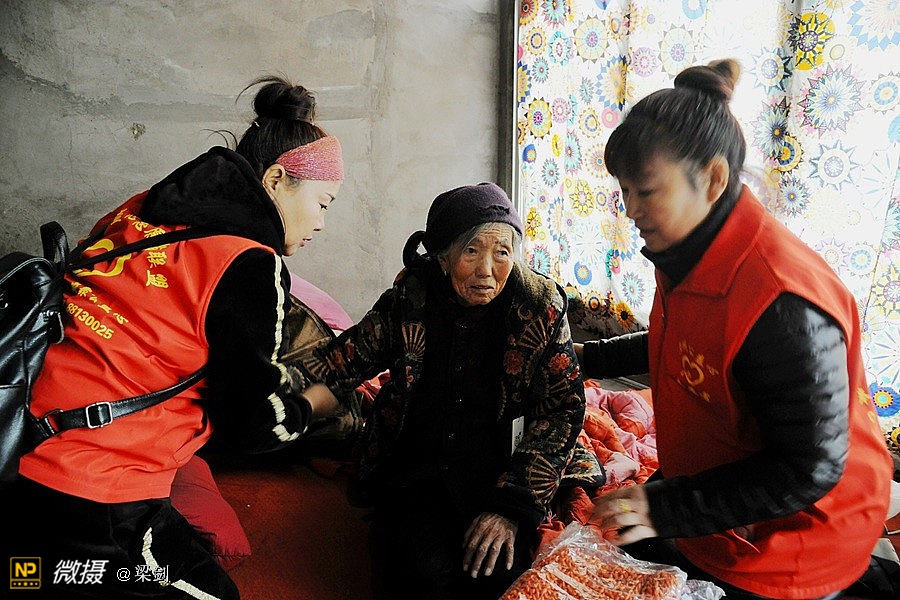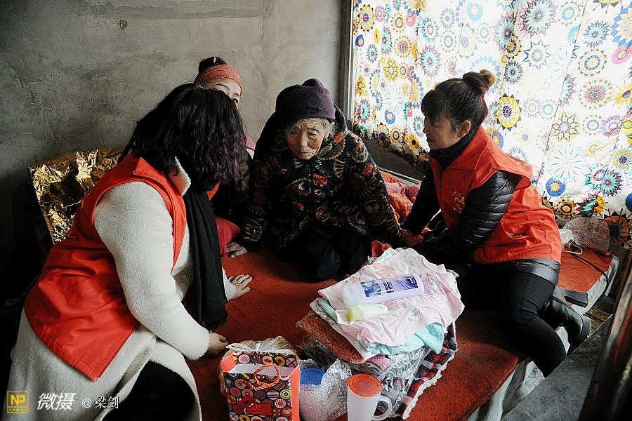 志愿者们走进五户贫困家庭的走访,给老人送上棉衣和生活用品。志愿者在看望贫困老人同时还自己掏出现金,塞给老人手中