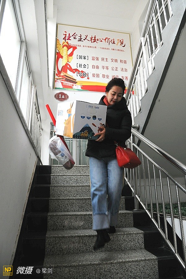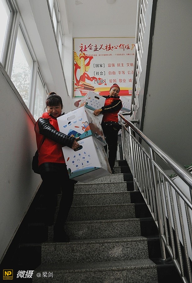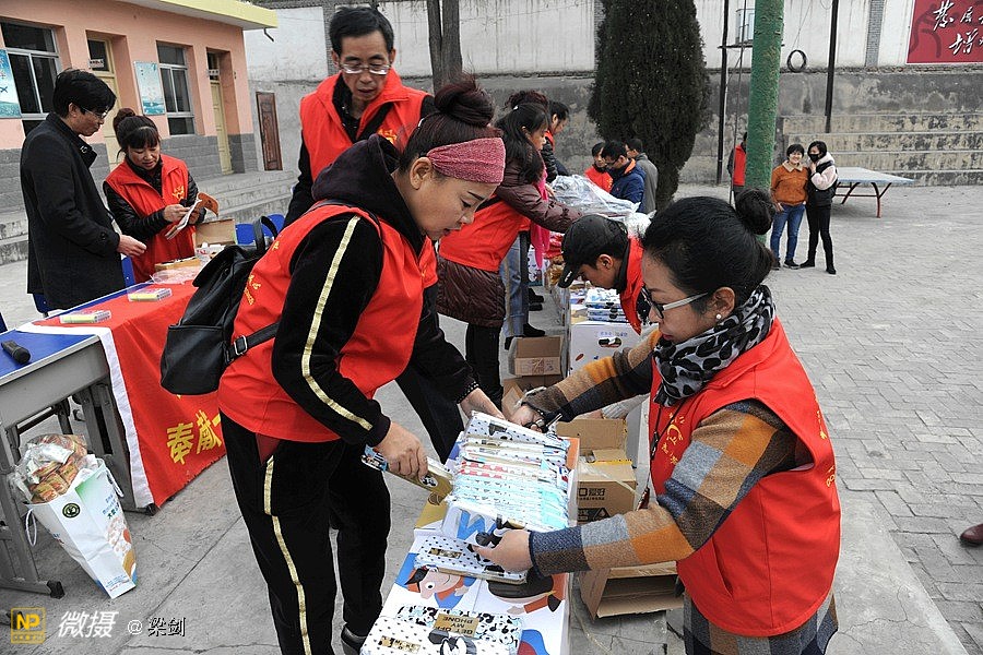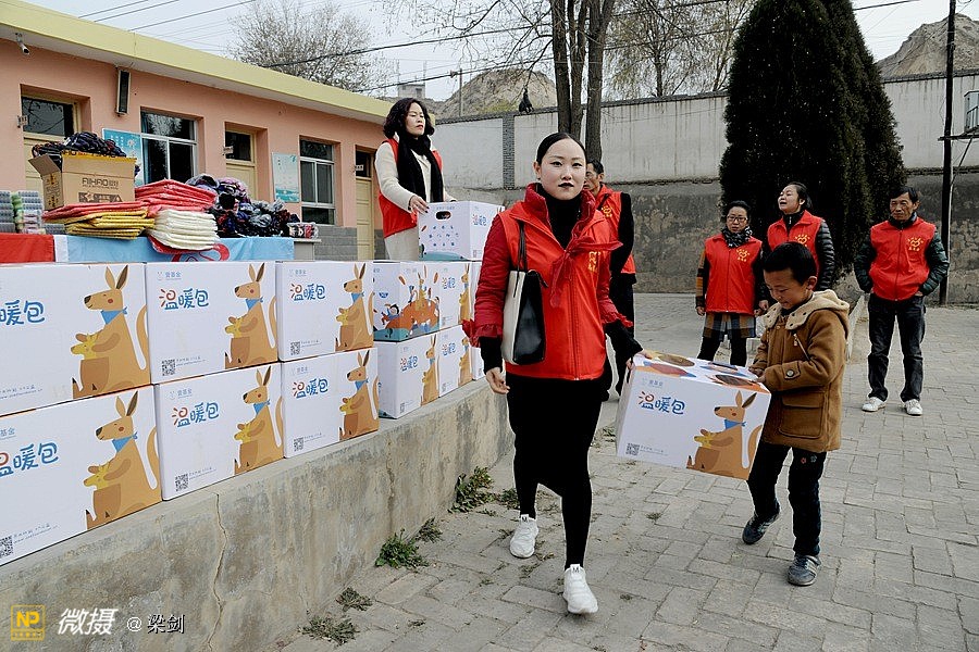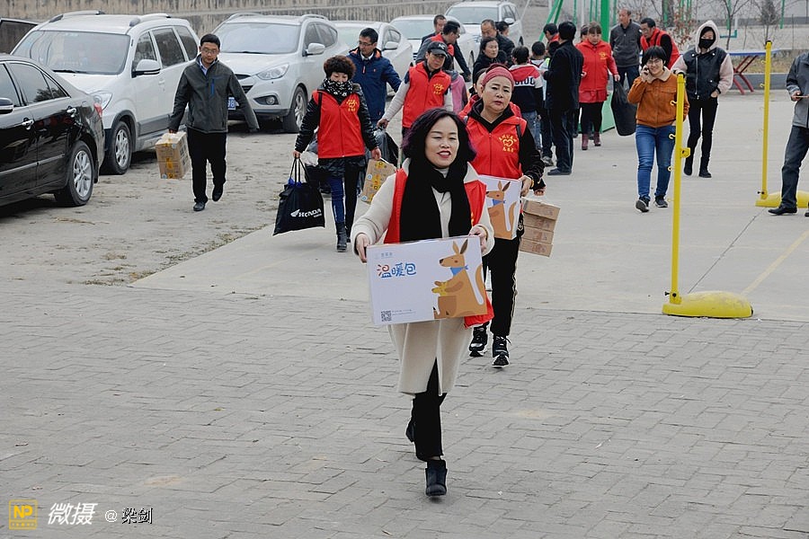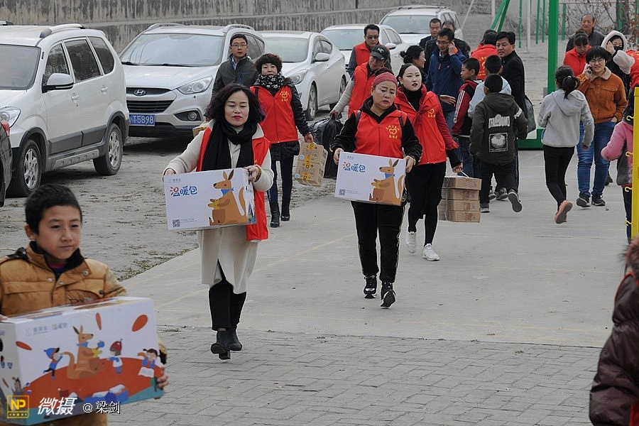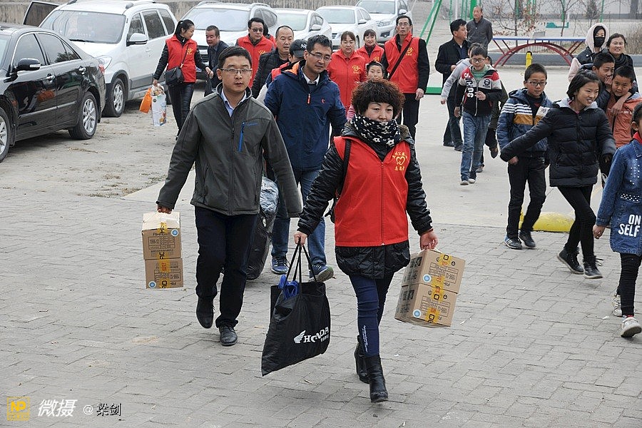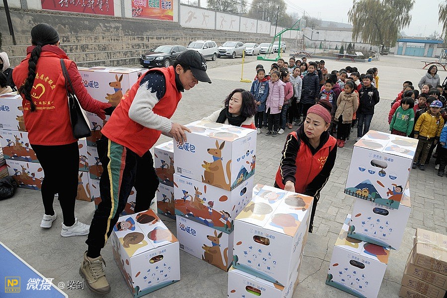 当时天气有风寒冷,但志愿者、学生欢快和老师们高兴沟通,在笑声中大家又开始卸车搬运爱心物资