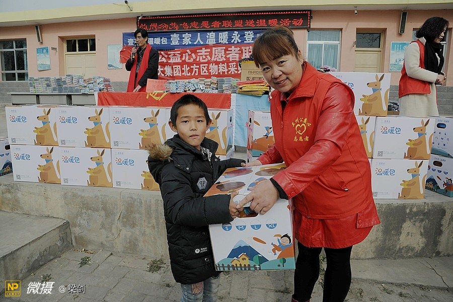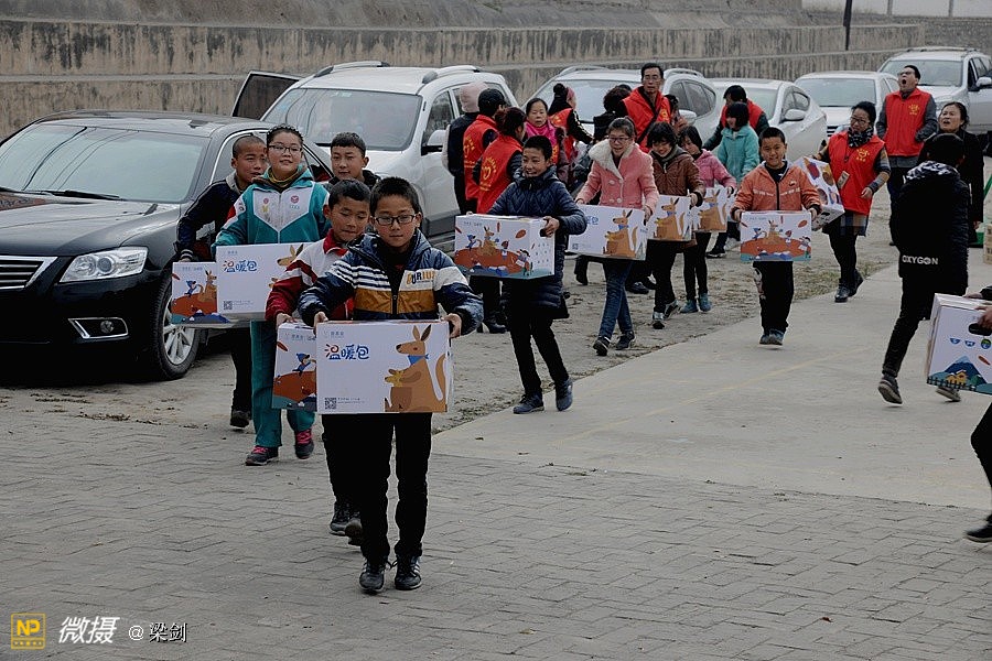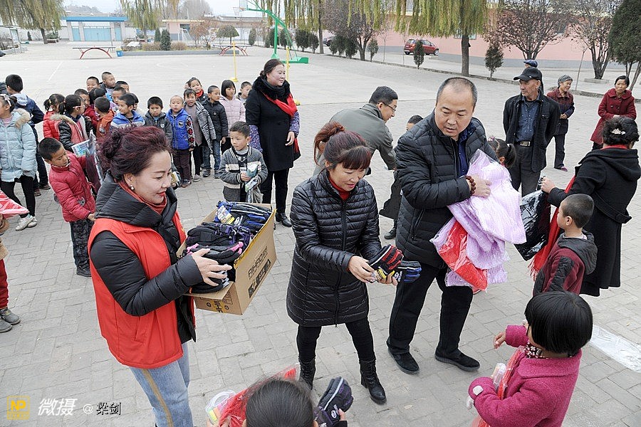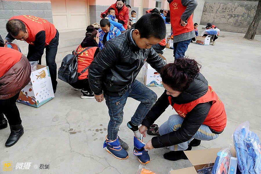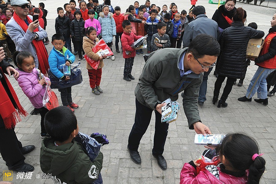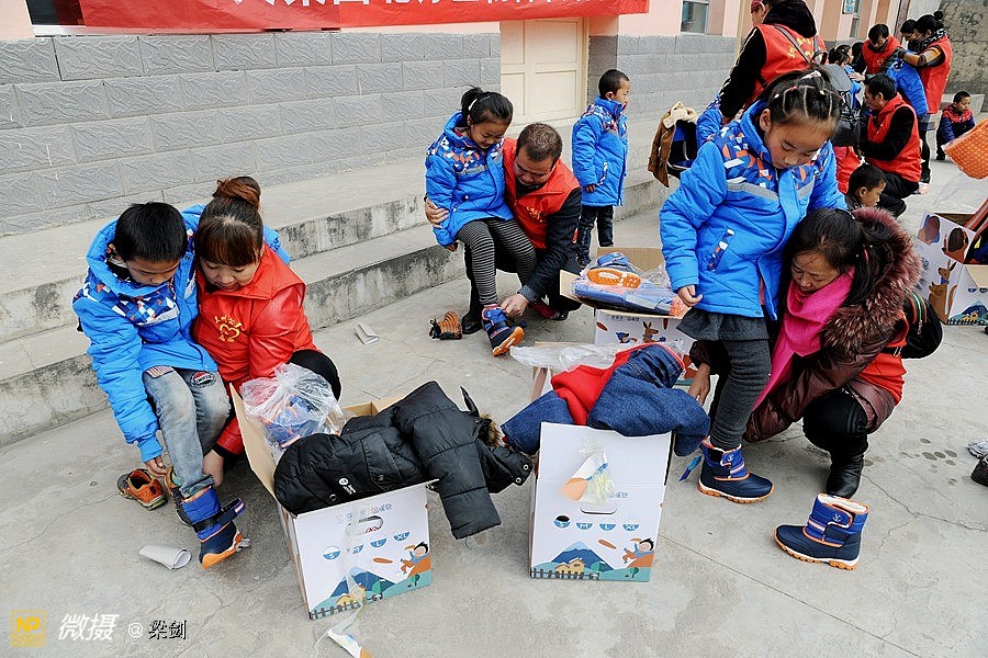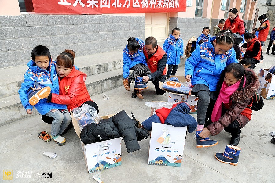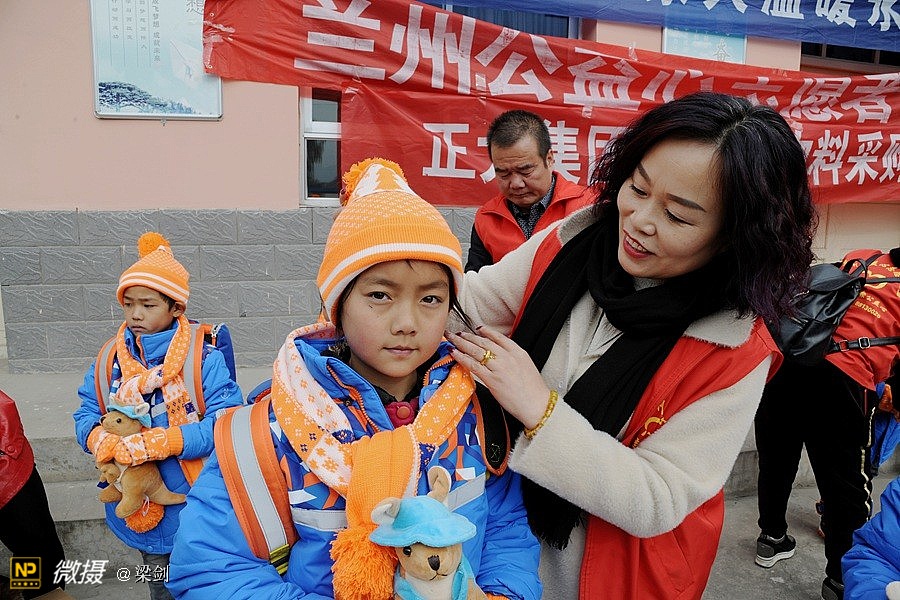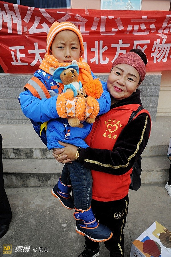 给25名孩子发放了温暖包,志愿者们给孩子们穿戴上了新衣服、新鞋子、戴新帽,还有围巾帽子玩具文具和书包,孩子们开心极了