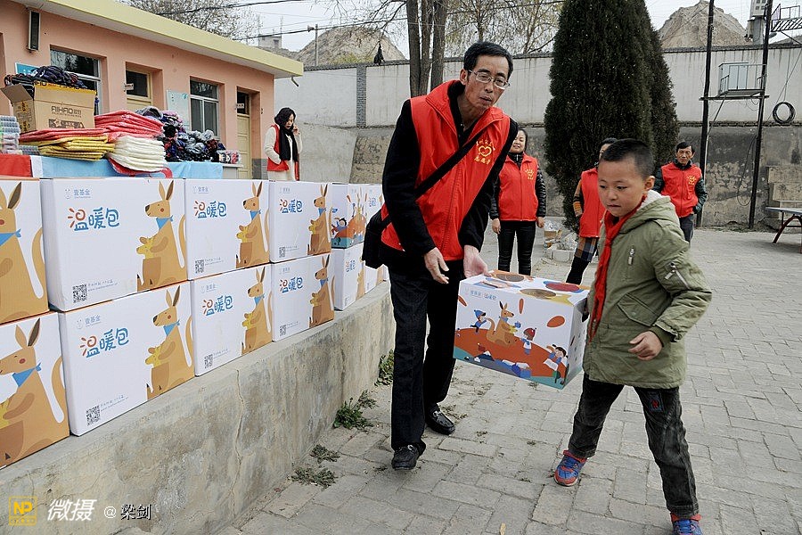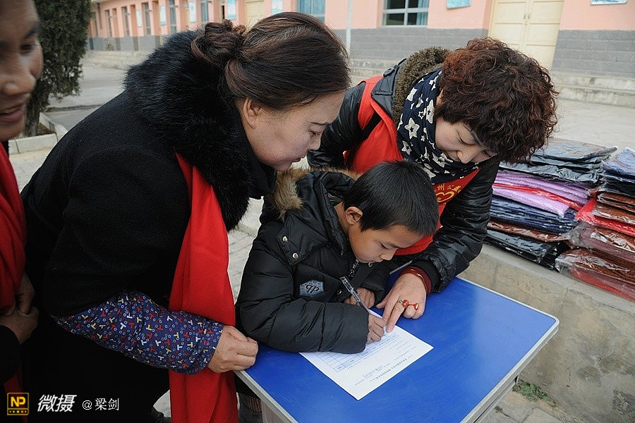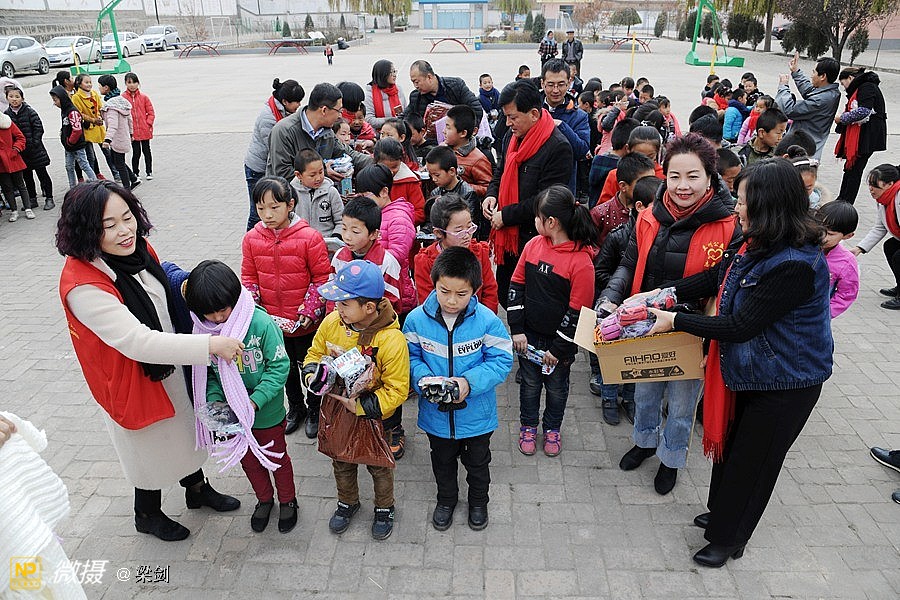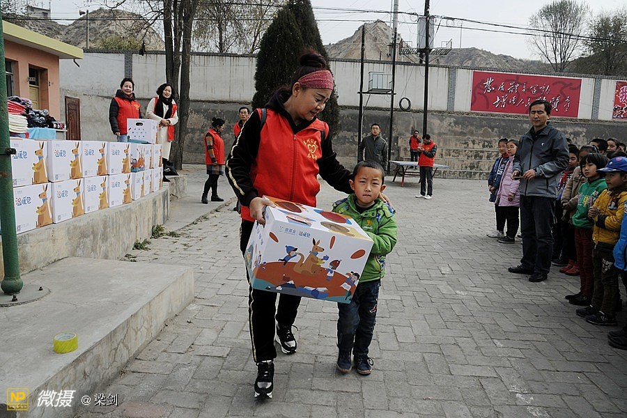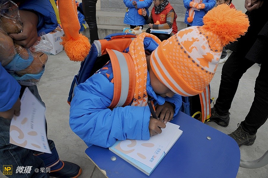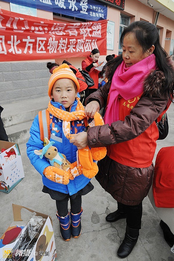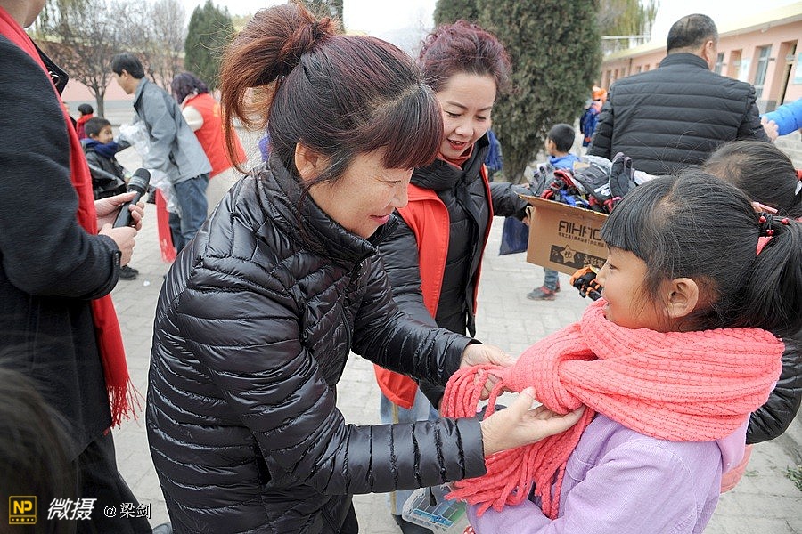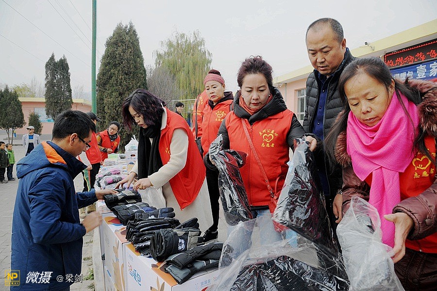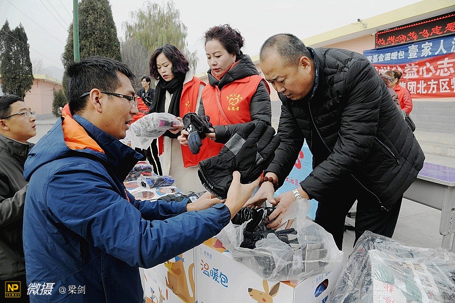 给25名孩子发放了温暖包,志愿者们给孩子们穿戴上了新衣服、新鞋子、戴新帽,还有围巾帽子玩具文具和书包,孩子们开心极了