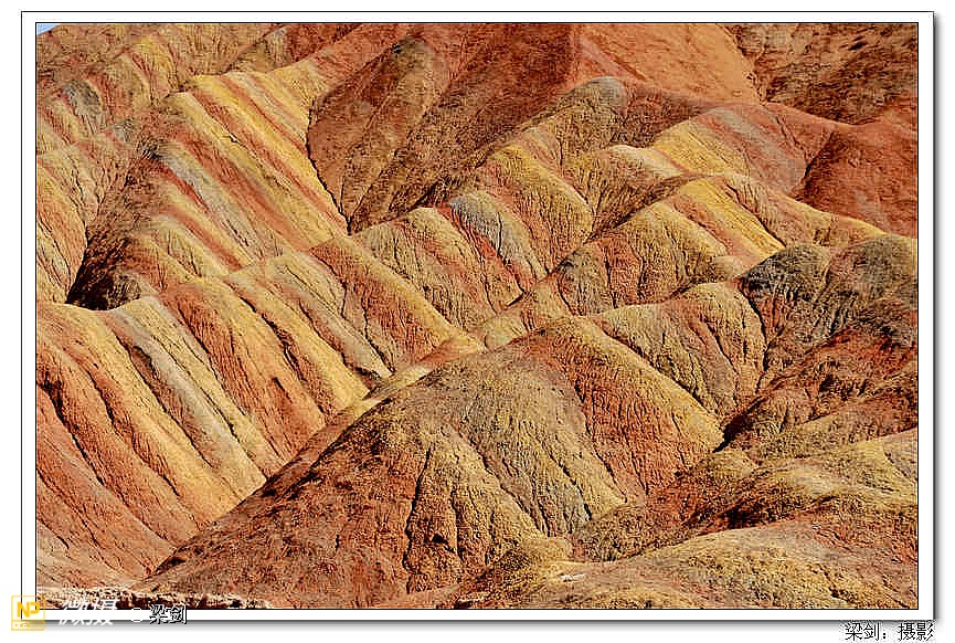 张掖的丹霞地貌,如用文字来表达,仅有两个字震撼。其气势之磅礴、场面之壮观、造型之奇特、色彩之斑斓,大自然的鬼斧神工,令人惊叹。她不仅具有一般丹霞的奇、险,而且更美的在于色。在方圆10多平方公里的范围内,随处可见有红、黄、橙、绿、白、青灰、灰黑、灰白等多种鲜艳的色彩,把无数沟 、山丘装点得绚丽多姿。在阳光的照射下,有的似金色的麦垛、金字塔、堡垒、殿堂、亭阁;有的连座成峰,形成绵延几里,从高处眺望,好似一段色彩十分艳丽丝绸飘在大地上;有的在阳光下突出暴露,绽放出眩人眼目的光彩,似五光十色的宝石璀璨……。张掖丹霞地貌以她那层理交错的线条、色彩斑澜的色调、灿烂夺目的壮美画图,形一个彩色童话世界---