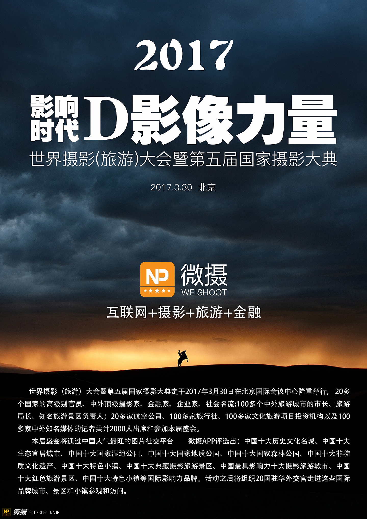 “第5届世界摄影(旅游)大会暨国家摄影大典”2017年3月31日将在北京国际会议中心隆重举行。20多个国家的高级别官员、中外顶级摄影家、金融家、企业家、社会名流;100多个中外旅游城市的市长、旅游局长、知名旅游景区负责人;20多家航空公司、100多家旅行社、100多家文化旅游项目投资机构以及100多家中外知名媒体的记者共计2000人出席和参加本届盛会。