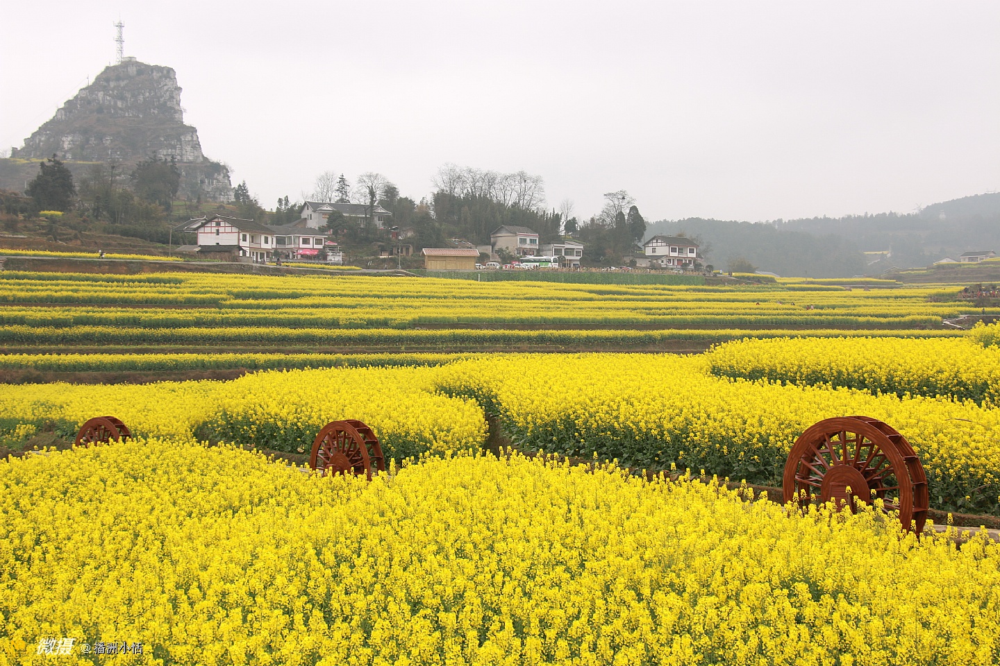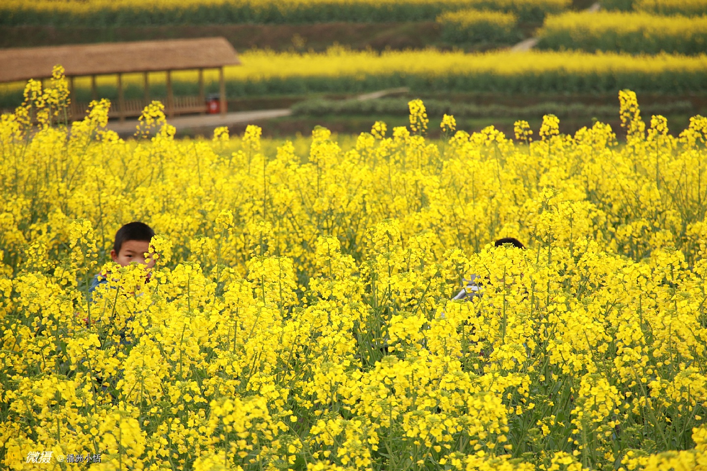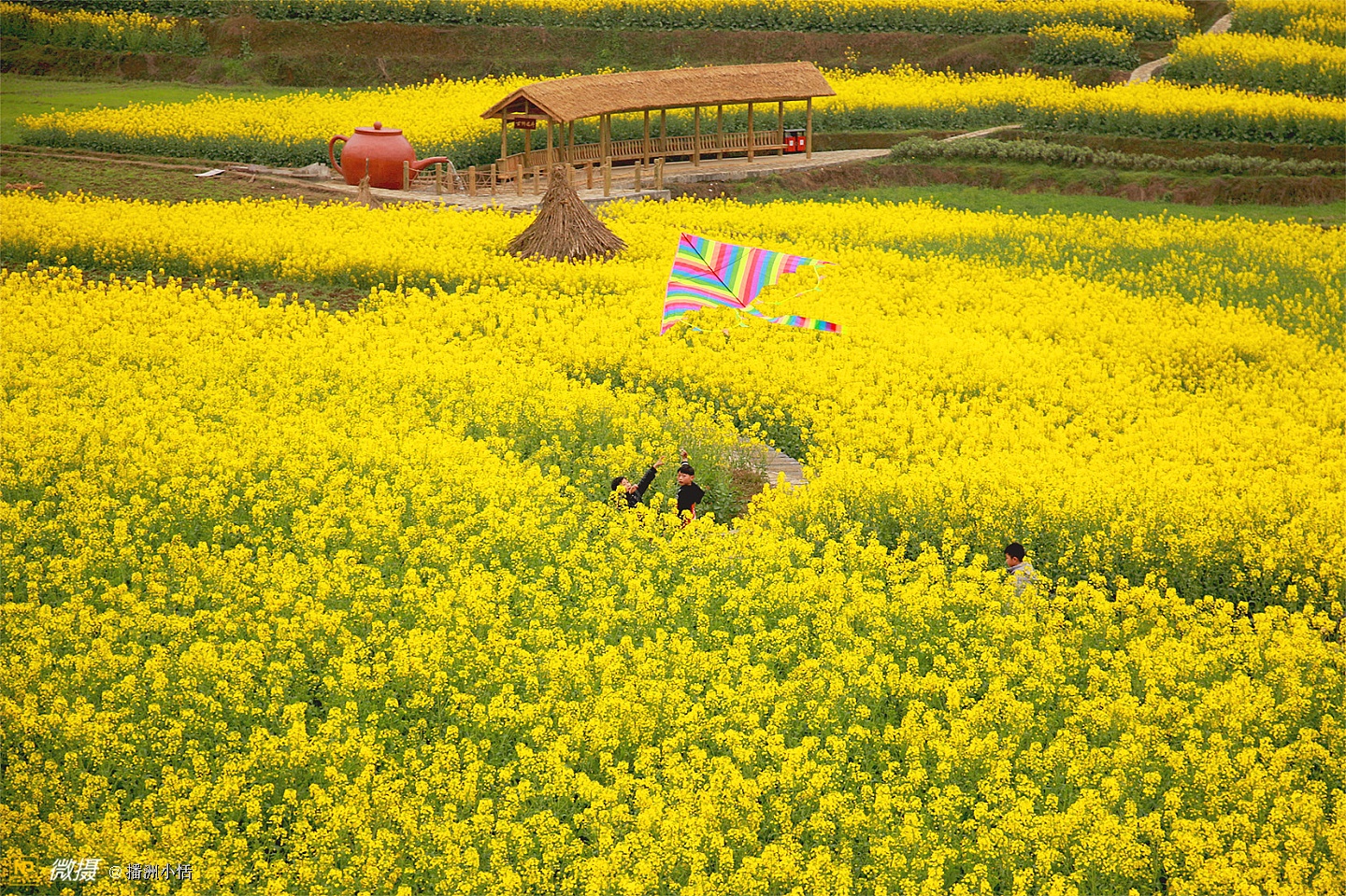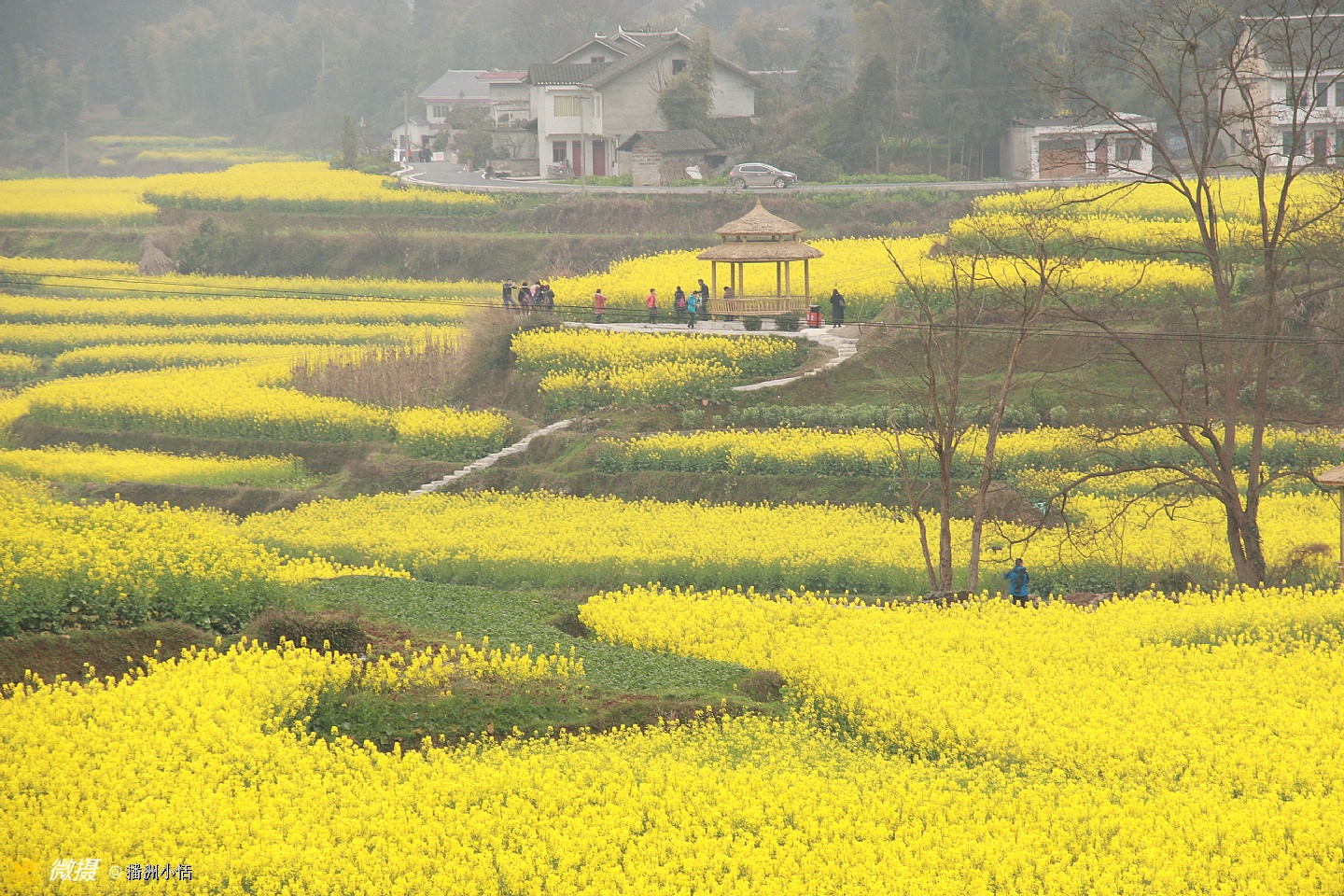 “山枕薄雾隐浓妆,风摇菜花送春芳”描写的就是莲池村美丽的景色。大片大片的油菜花竞相开放,流金溢彩,仿佛是金色的海洋。有的像一条条黄金织成的绸带,环绕山峦,层层叠金,错落有致。置身花海中,沁人心脾的菜花香让人沉醉。花海与村落、亭阁交相辉映,构成一幅绝美的乡居画卷。