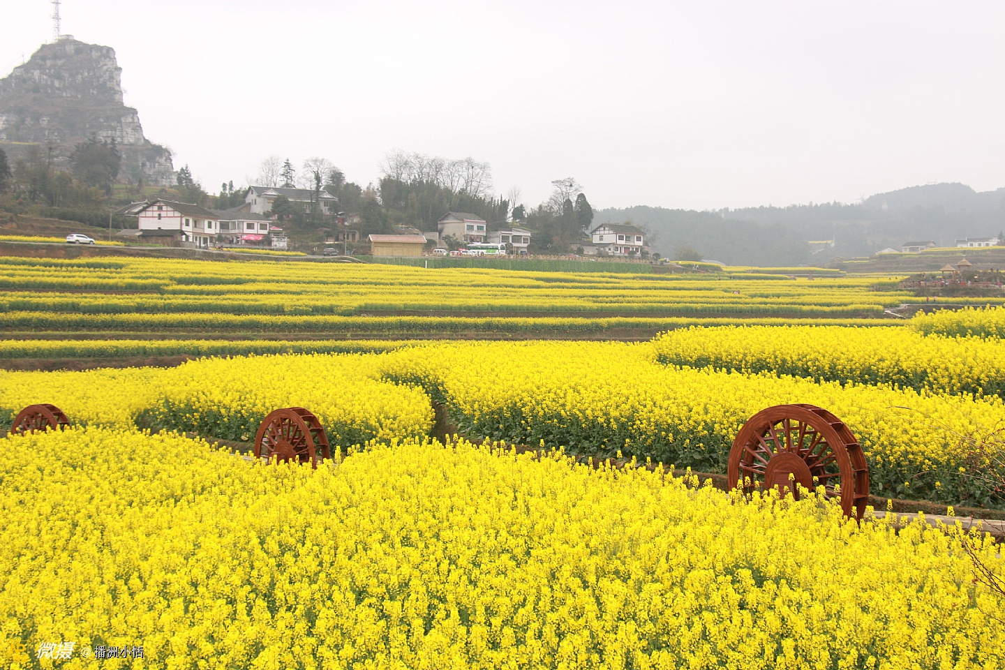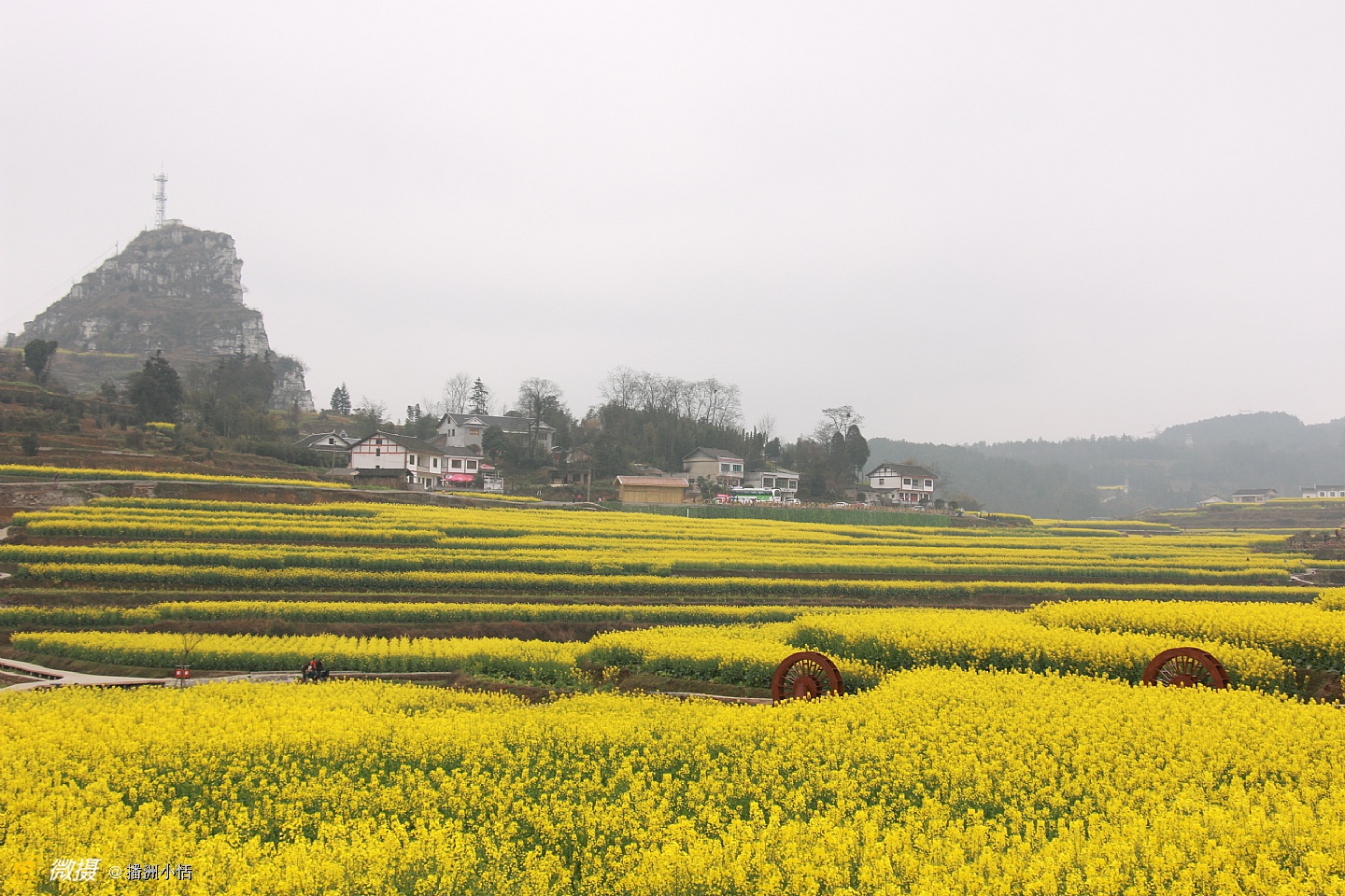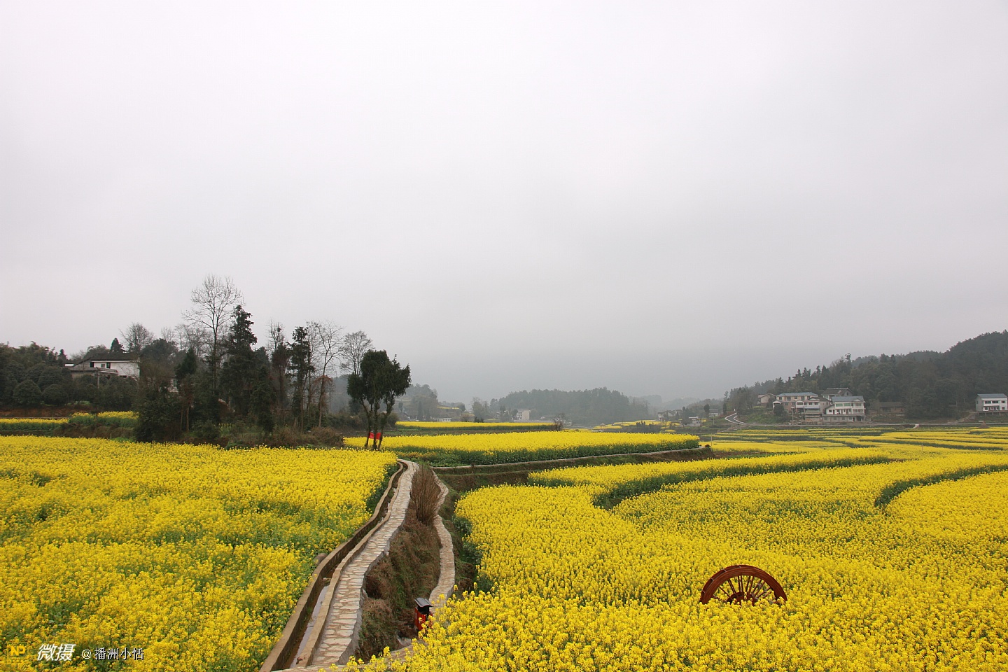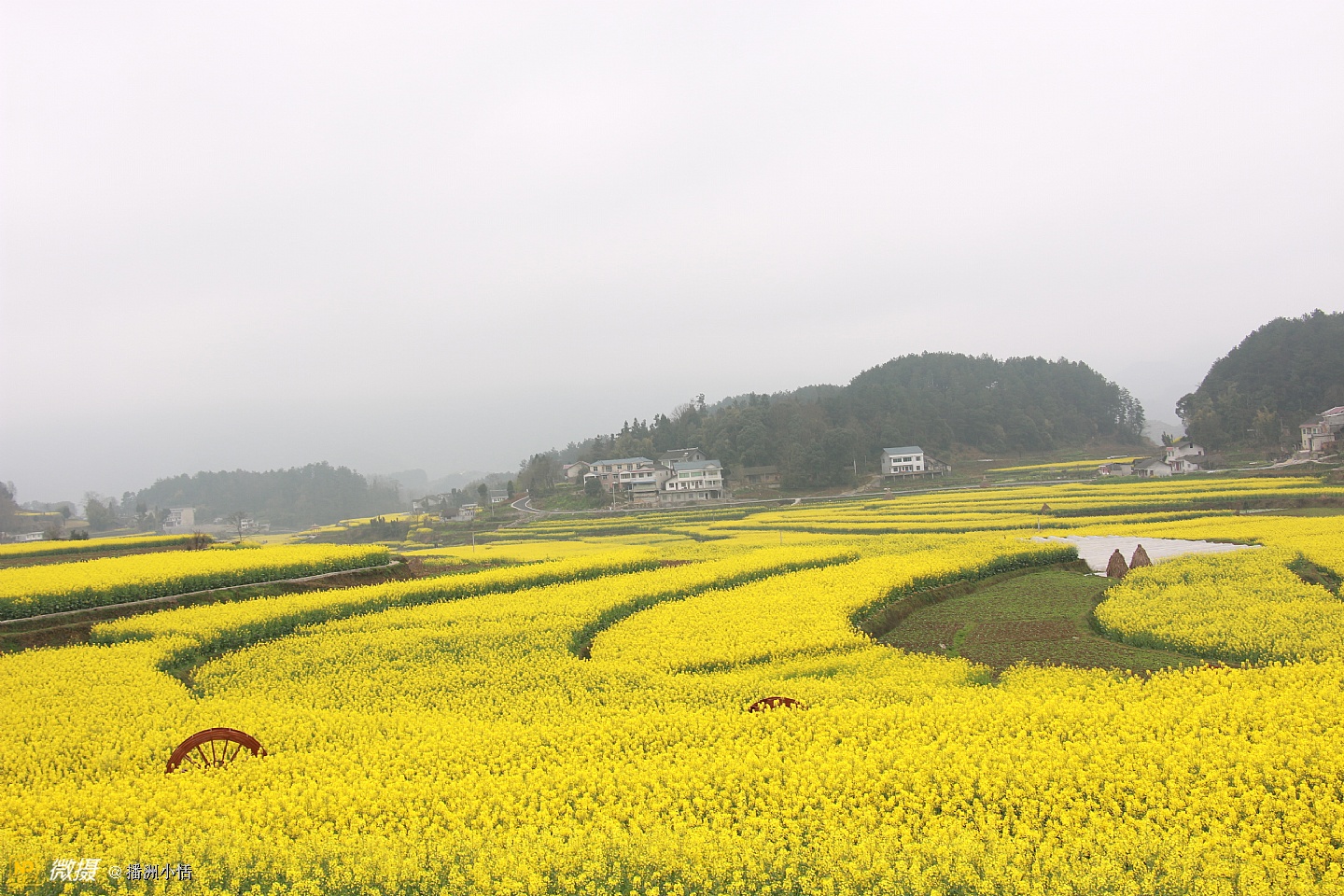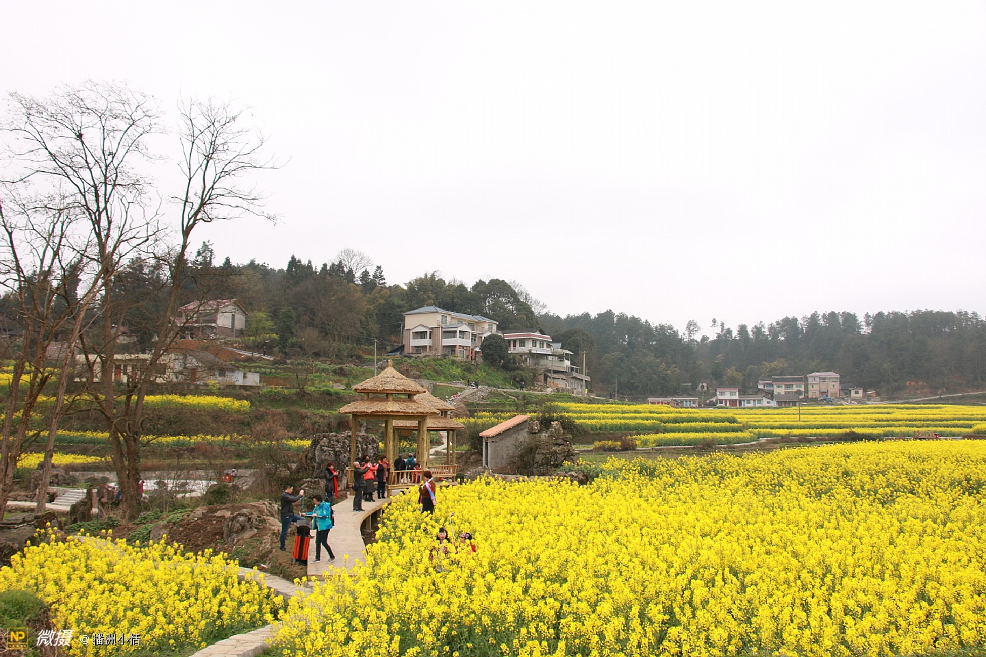 “山枕薄雾隐浓妆,风摇菜花送春芳”描写的就是莲池村美丽的景色。大片大片的油菜花竞相开放,流金溢彩,仿佛是金色的海洋。有的像一条条黄金织成的绸带,环绕山峦,层层叠金,错落有致。置身花海中,沁人心脾的菜花香让人沉醉。花海与村落、亭阁交相辉映,构成一幅绝美的乡居画卷。
