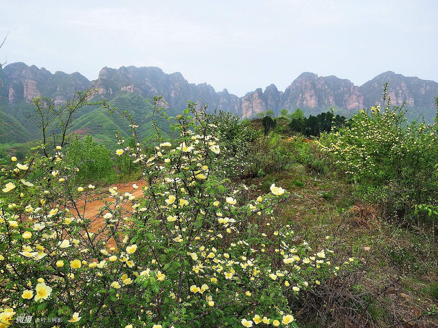 初春的赵沟,山花烂漫,春意盎然。漫山遍野的野玫瑰正是盛花期!黄花绿草,蓝天白云,再加上远处隐藏在树丛中灰墙黛瓦的民居,远山近水,花丛村舍,以及田间地头劳动的村民,交相辉映在一起,如画如诗……