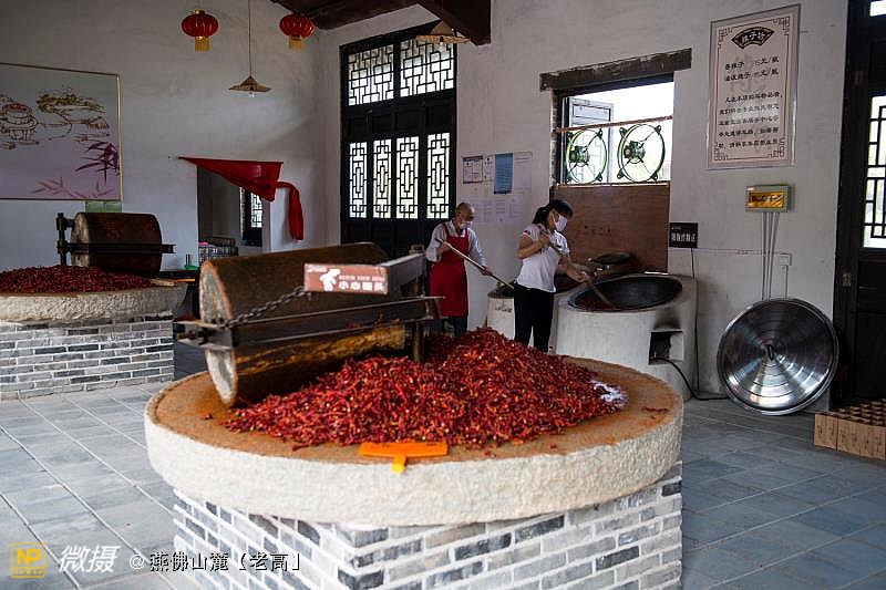 将炒制好的辣椒上磨进行碾压成粉,与古代不同的是磨盘不用人推了,用电力驱动。
