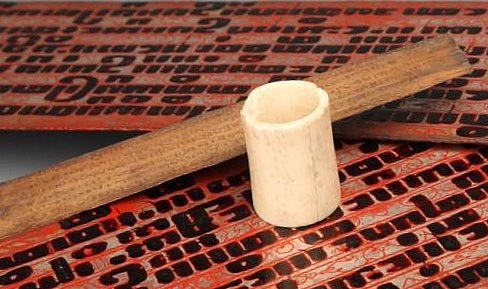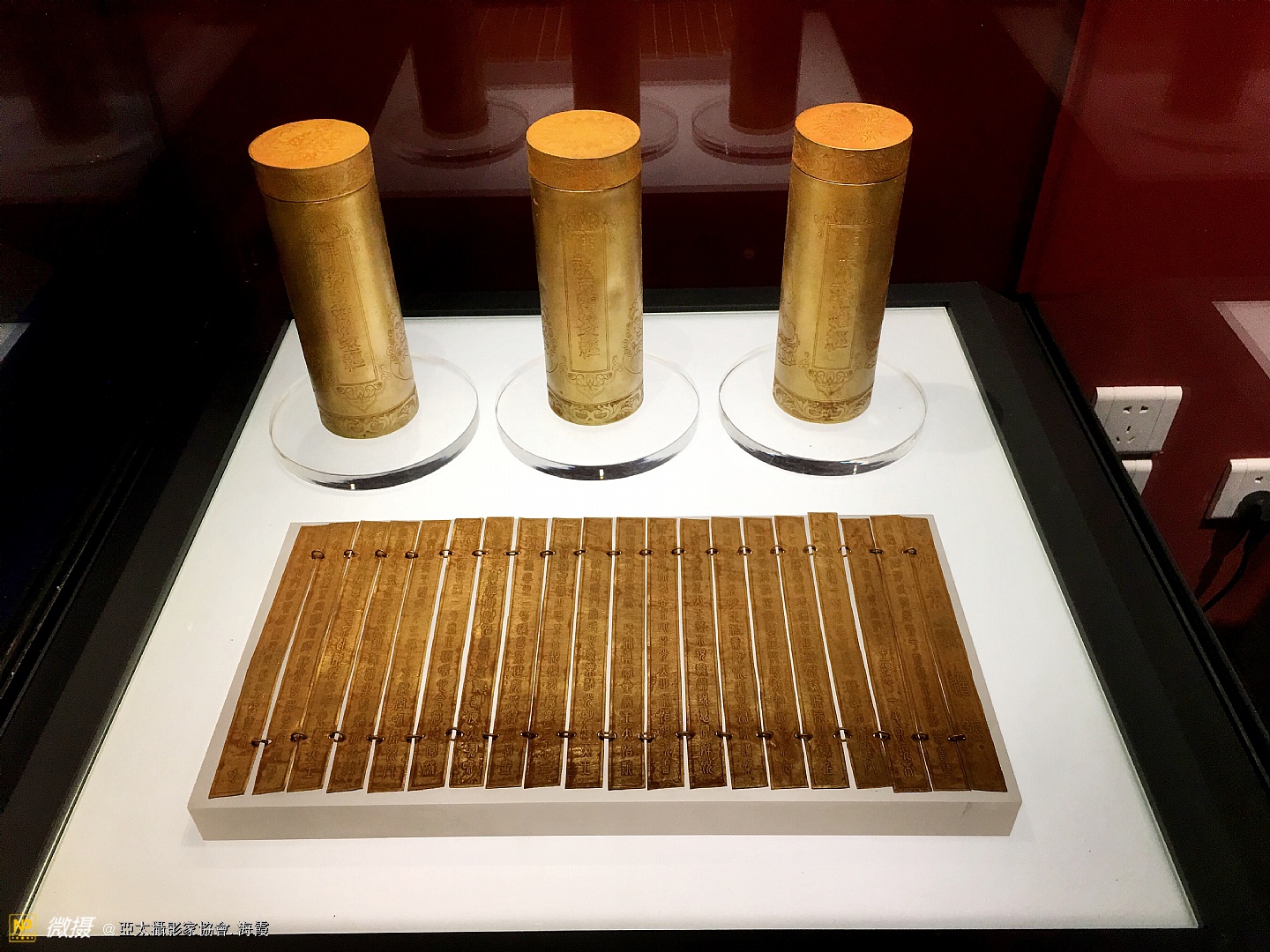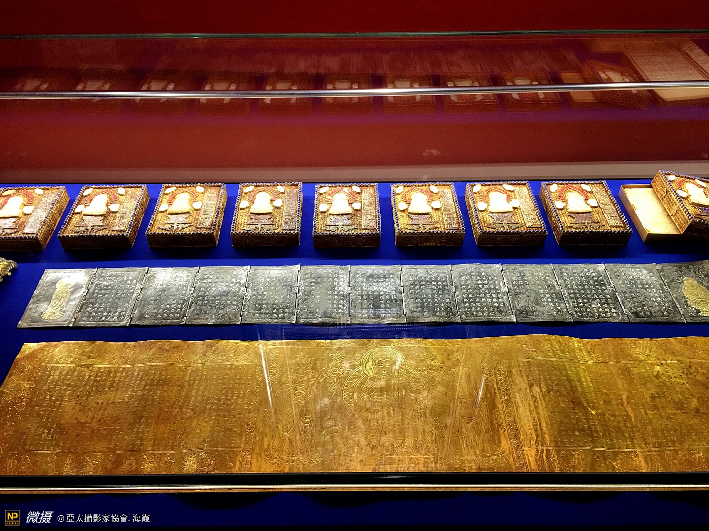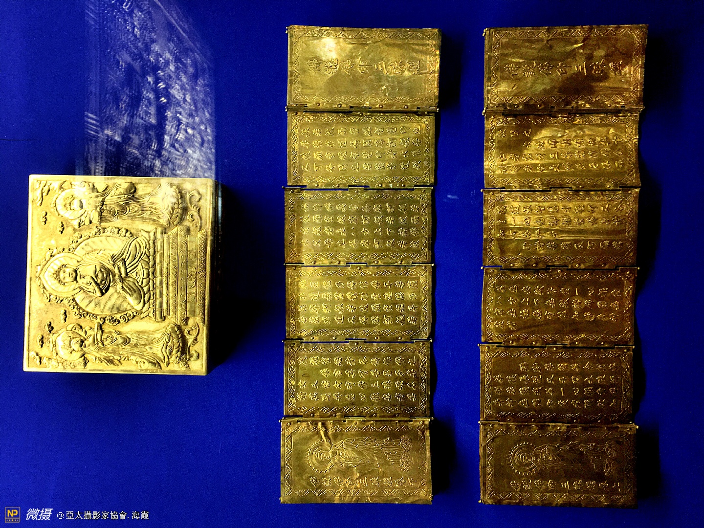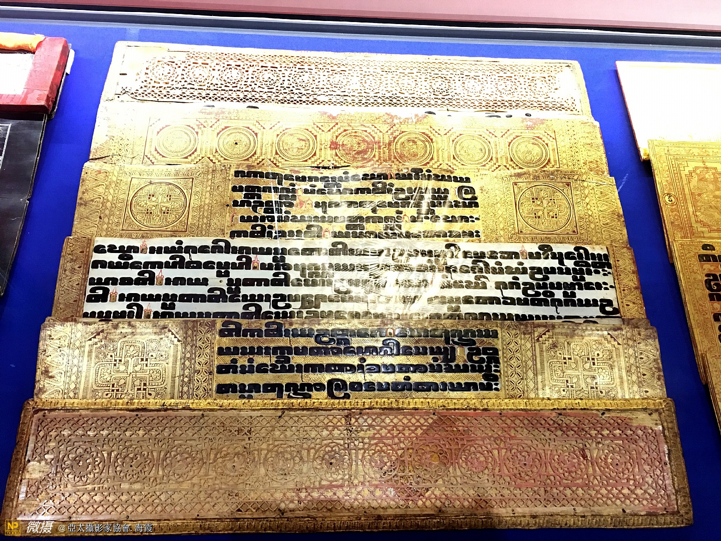 除世人熟知的贝多罗树叶刻写本外,我在坦博艺苑的藏经室里还见到了不常见甚至难得一见的漆片、金属片、象牙片等刻写本,且不说佛学原典的珍贵,经片本身的精美程度就足以令人咋舌。相比贝多罗树叶的刻写本,漆片的写本显得稍宽也厚,陈列在坦博艺苑明代徽派老祠堂里的噶玛巴贝叶经写本,就是写在漆片上的经文。不同于一般贝叶经只刻字写经,漆片与金属片、象牙片的写本和刻写本除了刻字写字外,往往还会将经片的两端或周边刻绘满带有佛教寓意的图形与纹饰,使之充满了佛学意味。