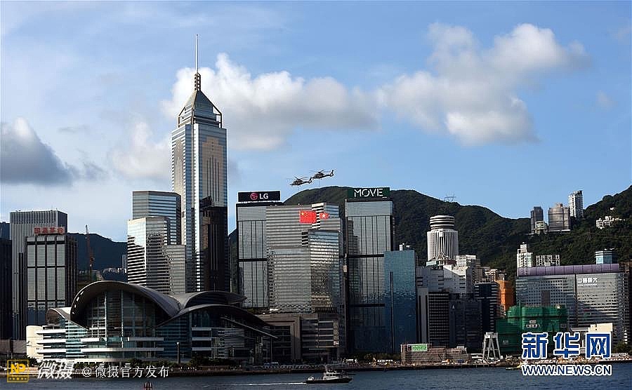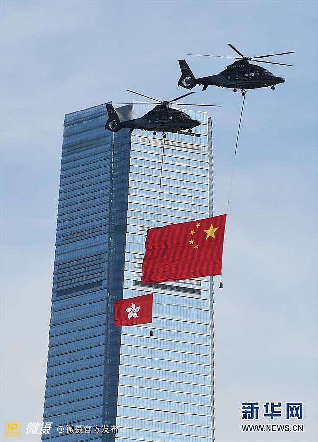 7月1日,香港特区政府在金紫荆广场举行升旗仪式,庆祝香港回归祖国20周年。这是两架分别悬挂中华人民共和国国旗、香港特区区旗的直升机从空中飞过。新华社发(王申 摄)