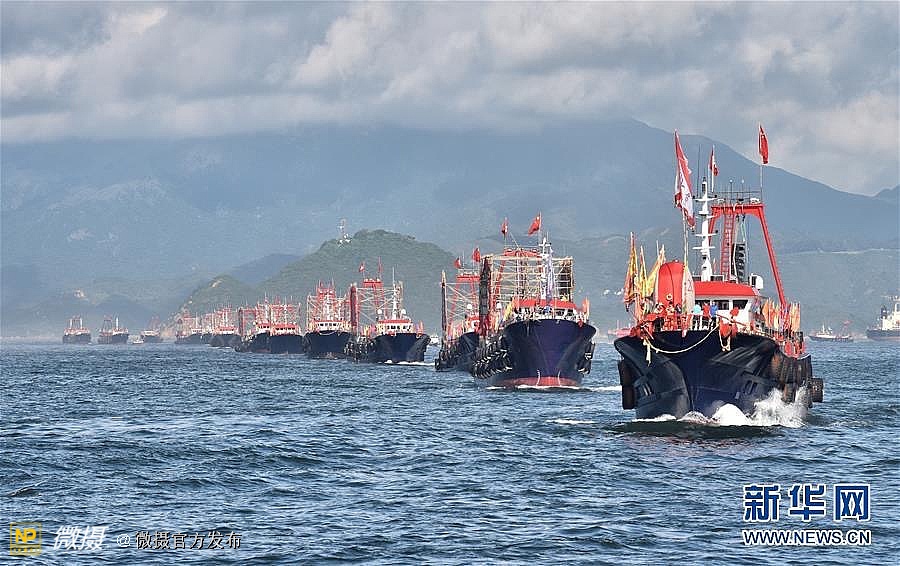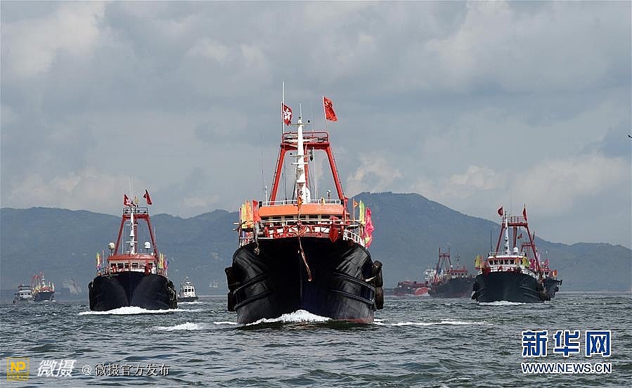 7月1日,香港渔民团体联会和香港各界庆典委员会组织一百艘渔船在香港维多利亚湾巡游,庆祝香港回归祖国二十周年。这是巡游渔船行驶在维多利亚湾。新华社记者 章磊 摄