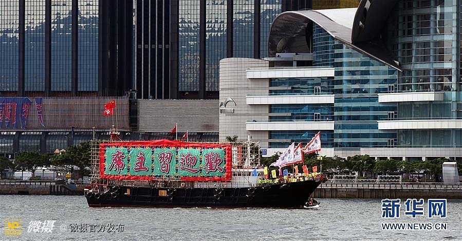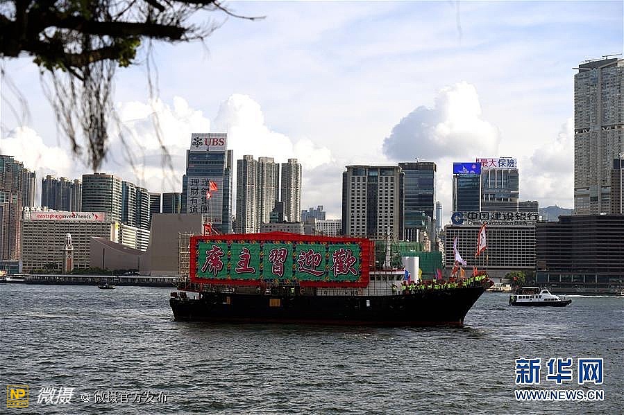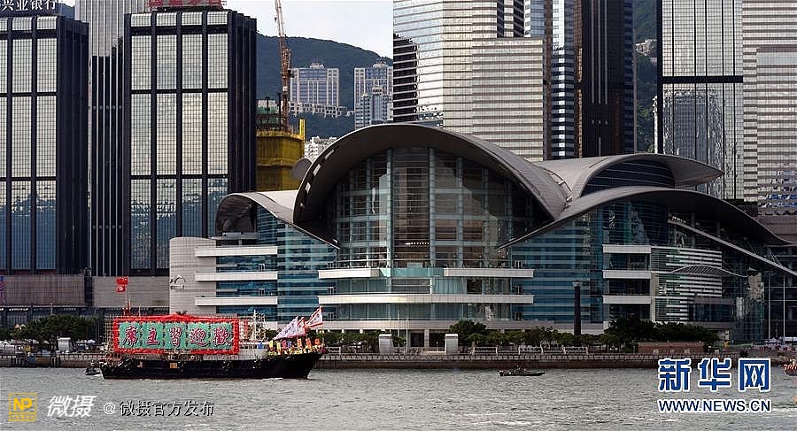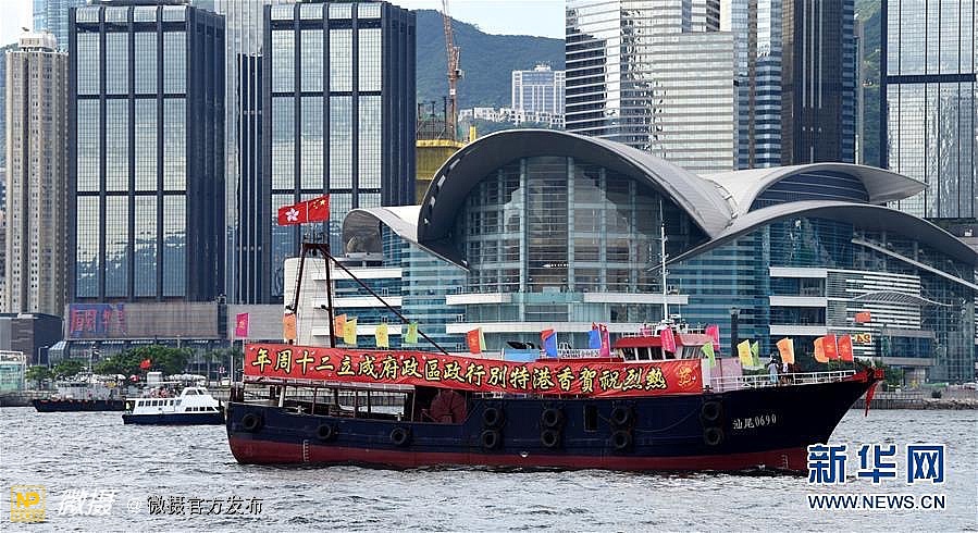 7月1日,香港渔民团体联会和香港各界庆典委员会组织一百艘渔船在香港维多利亚湾巡游,庆祝香港回归祖国二十周年。这是巡游渔船从香港会展中心前驶过。新华社记者 卢炳辉 摄