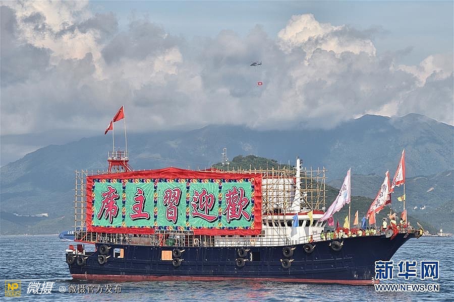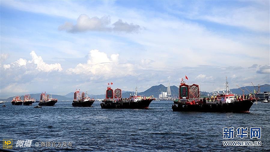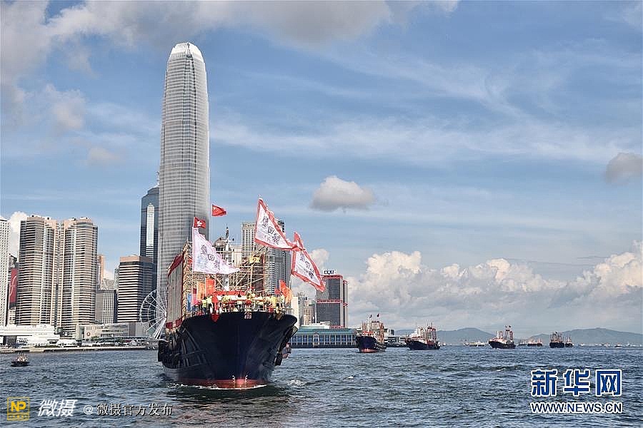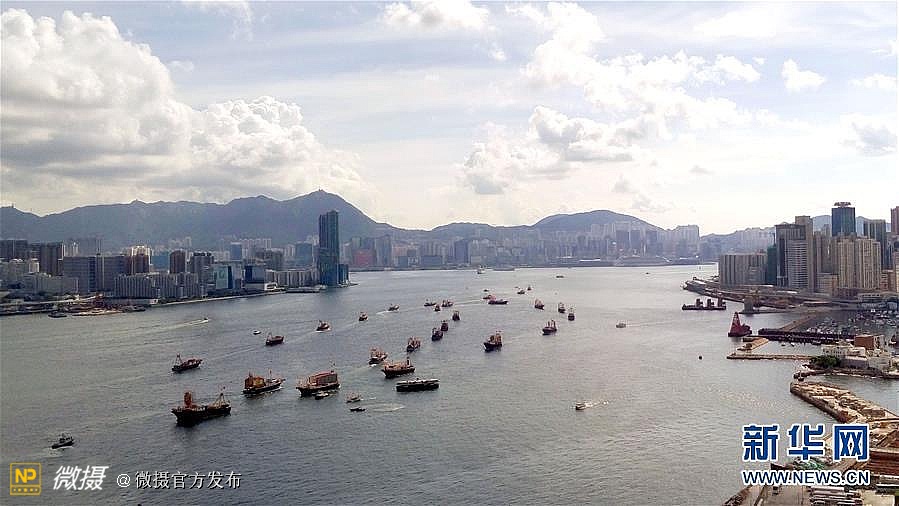 7月1日,香港渔民团体联会和香港各界庆典委员会组织一百艘渔船在香港维多利亚湾巡游,庆祝香港回归祖国二十周年。这是巡游渔船行驶在维多利亚湾。新华社发(王申 摄)