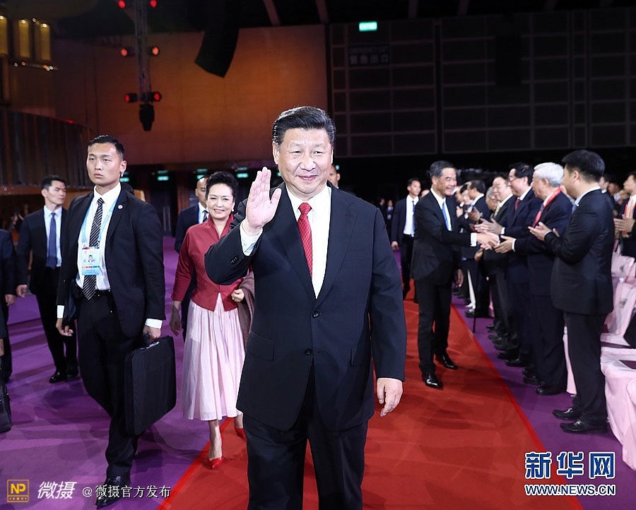 6月30日晚,中共中央总书记、国家主席、中央军委主席习近平在香港会展中心观看《心连心·创未来》庆祝香港回归祖国20周年文艺晚会。这是习近平和夫人彭丽媛步入晚会现场。新华社记者 鞠鹏 摄