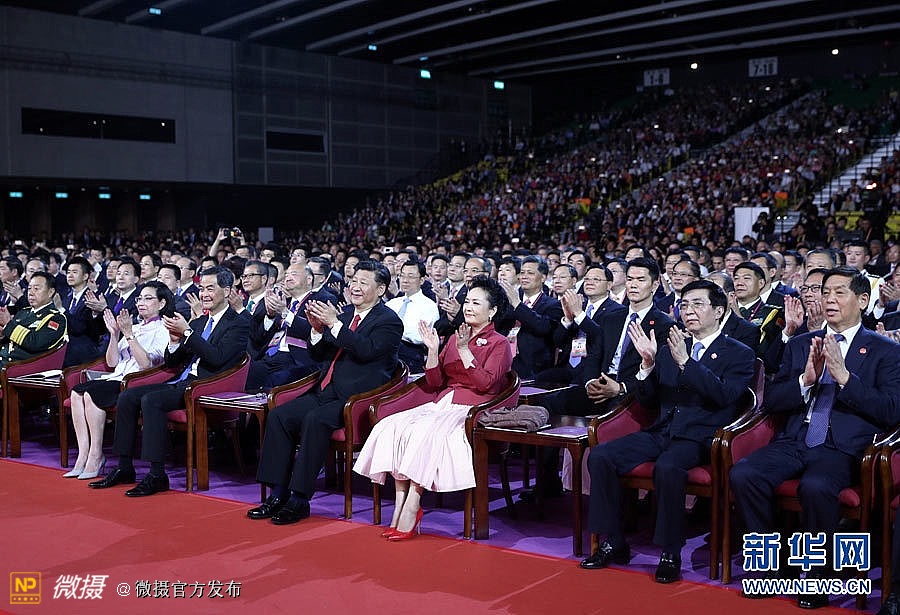 6月30日晚,中共中央总书记、国家主席、中央军委主席习近平在香港会展中心观看《心连心·创未来》庆祝香港回归祖国20周年文艺晚会。新华社记者 鞠鹏 摄