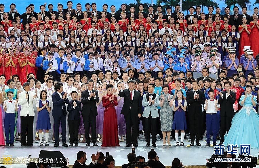 6月30日晚,中共中央总书记、国家主席、中央军委主席习近平在香港会展中心观看《心连心·创未来》庆祝香港回归祖国20周年文艺晚会。这是晚会最后,习近平走上舞台,同主要演职人员一一握手,并同全场一起高唱《歌唱祖国》,祝愿伟大祖国繁荣昌盛,祝福香港明天更加美好。新华社记者 马占成 摄
