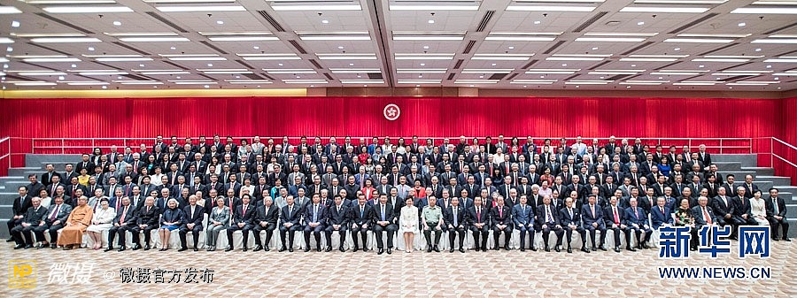 7月1日,庆祝香港回归祖国二十周年大会暨香港特别行政区第五届政府就职典礼在香港会展中心举行。这是在行政长官林郑月娥的监誓下,香港特别行政区行政会议成员宣誓就职。新华社记者 李涛 摄
