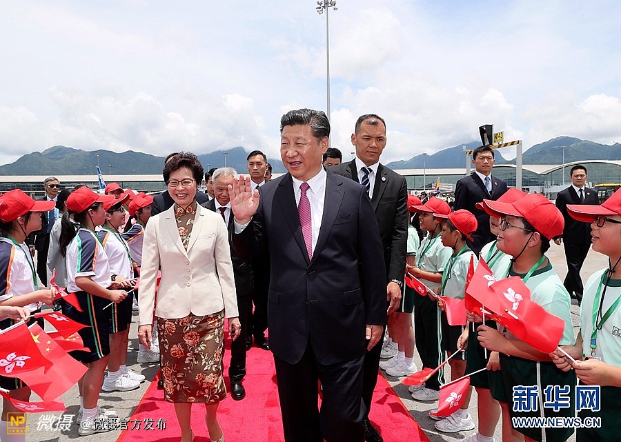 7月1日中午,中共中央总书记、国家主席、中央军委主席习近平圆满结束在香港的各项活动,从香港乘专机返回北京。这是在欢送仪式上,习近平向欢送队伍挥手道别。 新华社记者 兰红光 摄