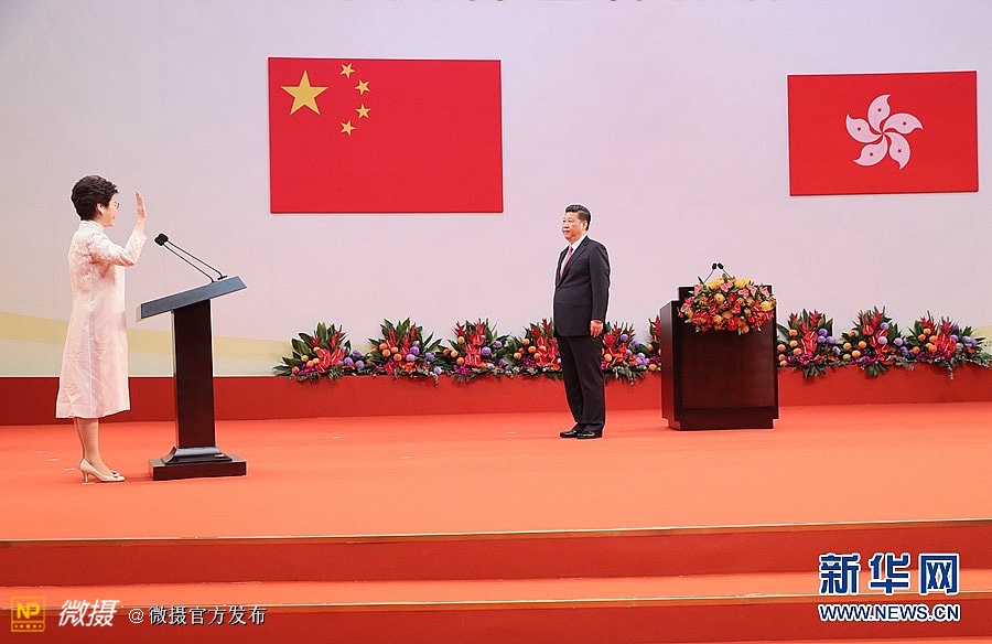 7月1日上午,庆祝香港回归祖国20周年大会暨香港特别行政区第五届政府就职典礼在香港会展中心隆重举行。中共中央总书记、国家主席、中央军委主席习近平出席并发表重要讲话。这是习近平监誓,香港特别行政区第五任行政长官林郑月娥宣誓就职。新华社记者 兰红光 摄