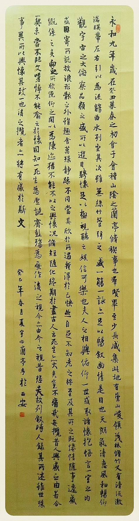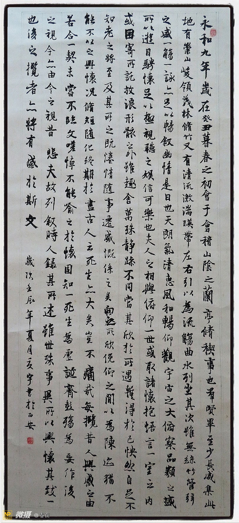王羲之兰亭序书法赏析:兰亭集序全文单字高清放大行书字帖《兰亭序》是王羲之47岁时的书作,记述的是王羲之和友人雅士会聚兰亭的盛游之事。全篇写的从容娴和,气盛神凝。被后世学书者尊崇为“天下第一行书”。《兰亭序》共计三百二十七个字,逸笔天成,而且变化结构、转换笔法,匠心独运而又不毫无安排造作的痕迹。这样的基于资质超群,功臣力深厚的作品,被评“为天下第一行书” ,确实是当之无愧的。兰亭书法,符合传统书法最基本的审美观,“文而不华、质而不野、不激不厉、温文尔雅”。“内恹”的笔法偏重骨力,刚柔相济,点画凝练简洁;在书写技巧上包含了无数变化之道,仅一个“之”字就有十余种写法,在传统的“中和之美”的格式上成为样板。千余年来,历代文人多以《兰亭序》为标准,笔耕不辍。人们习惯地把书法家写《兰亭序》的水准作为衡量其传统功力的尺度。《兰亭序》不愧为博涉众美的经典之作,读其文、赏其书、品其趣,是一种非凡的艺术享受。兰亭集序原文及翻译原文:永和九年,岁在癸丑,暮春之初,会于会稽山阴之兰亭,修禊事也。群贤毕至,少长咸集。此地有崇山峻岭,茂林修竹,又有清流激湍,映带左右。引以为流觞曲水,列坐其次,虽无丝竹管弦之盛,一觞一咏,亦足以畅叙幽情。是日也,天朗气清,惠风和畅。仰观宇宙之大,俯察品类之盛,所以游目骋怀,足以极视听之娱,信可乐也。 夫人之相与,俯仰一世。或取诸怀抱,悟言一室之内;或因寄所托,放浪形骸之外。虽趣舍万殊,静躁不同,当其欣于所遇,暂得于己,快然自足,不知老之将至;及其所之既倦,情随事迁,感慨系之矣。向之所欣,俯仰之间,已为陈迹,犹不能不以之兴怀,况修短随化,终期于尽!古人云,“死生亦大矣。”岂不痛哉! 每览昔人兴感之由,若合一契,未尝不临文嗟悼,不能喻之于怀。固知一死生为虚诞,齐彭殇为妄作。后之视今,亦犹今之视昔。悲夫!故列叙时人,录其所述。虽世殊事异,所以兴怀,其致一也。后之览者,亦将有感于斯文。译文:永和九年,即癸丑年,三月之初,(名士们)在会稽郡山阴县的兰亭聚会,为的是到水边进行消灾求福的活动。许多有声望有才气的人都来了,有年轻的,也有年长的。这里有高大的山和险峻的岭,有茂密的树林和高高的竹子,又有清水急流,(在亭的)左右辉映环绕。把水引到(亭中)的环形水渠里来,让酒杯飘流水上(供人们取饮)。人们在曲水旁边排列而坐,虽然没有管弦齐奏的盛况,(可