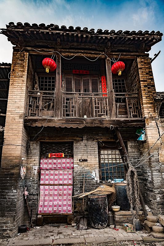 大阳古镇以一条老街作为串联,将东西大阳连接起来。在这个有千年辉煌的历史古镇中,散落着大量的明清以来保存下来的民居。这些民居主要以四合院为主。同时,由于战争的影响,大阳四合院在防卫功能上有比较突出的表现。受到风水观念的影响,还出现了一些三合院和九宫八卦式格局的院落。大阳的民居,套园特别多,房连房,楼接楼,空隙非常小。这与北方平原地区的四合院落迥然不同,属于典型的北方山区式庭院。
