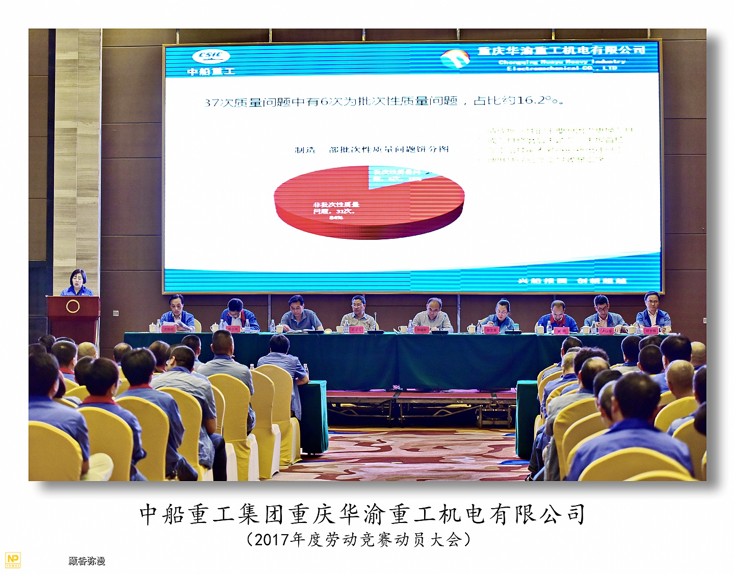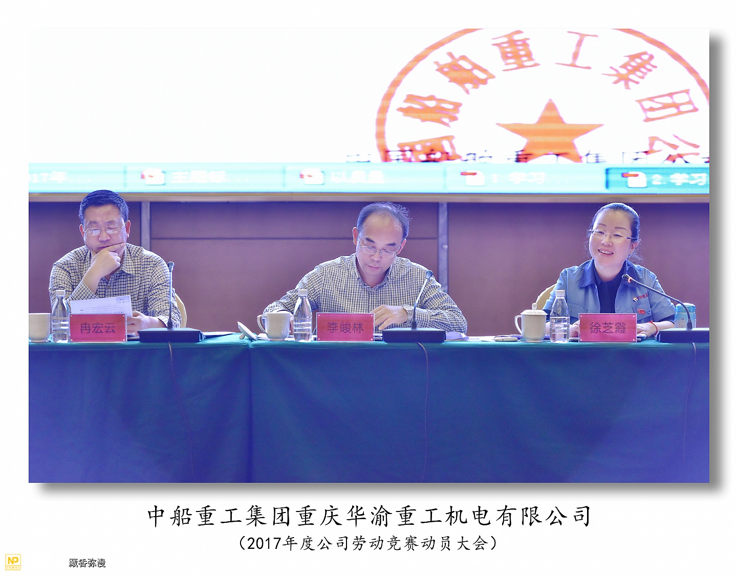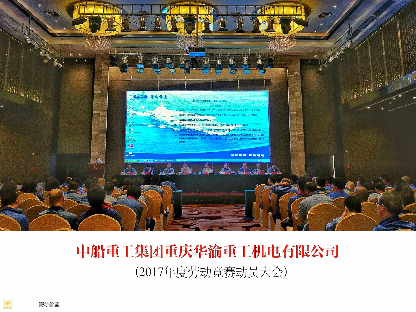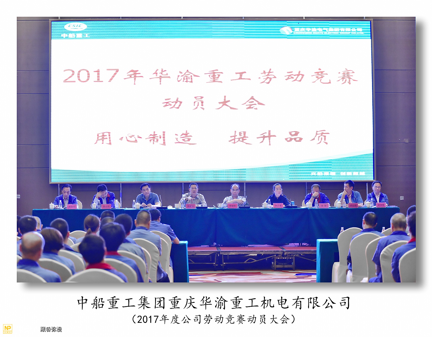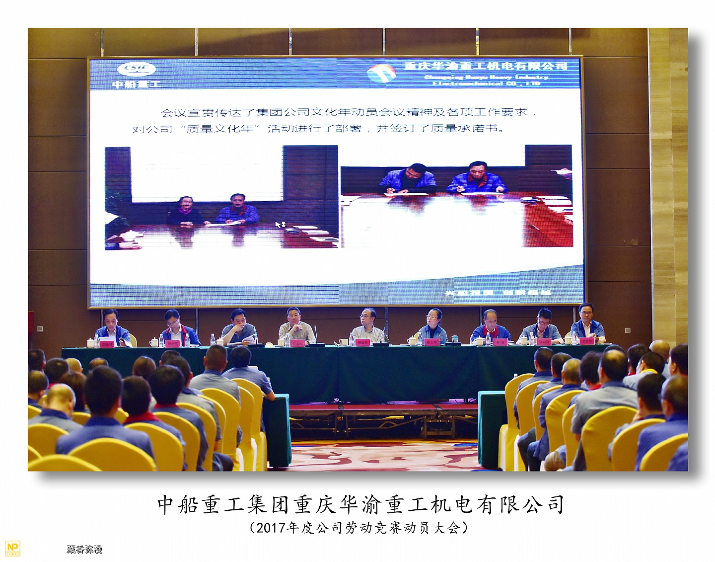 中船重工重庆华渝重工机电有限公司于2017年5月4日在两江新区鱼嘴瑞尔大酒店召开2017年度劳动竞赛动员大会,华渝集团总经理李俊林,工会主席冉宏云,人事处长王强,规划发展处副处长覃奋参加了大会。