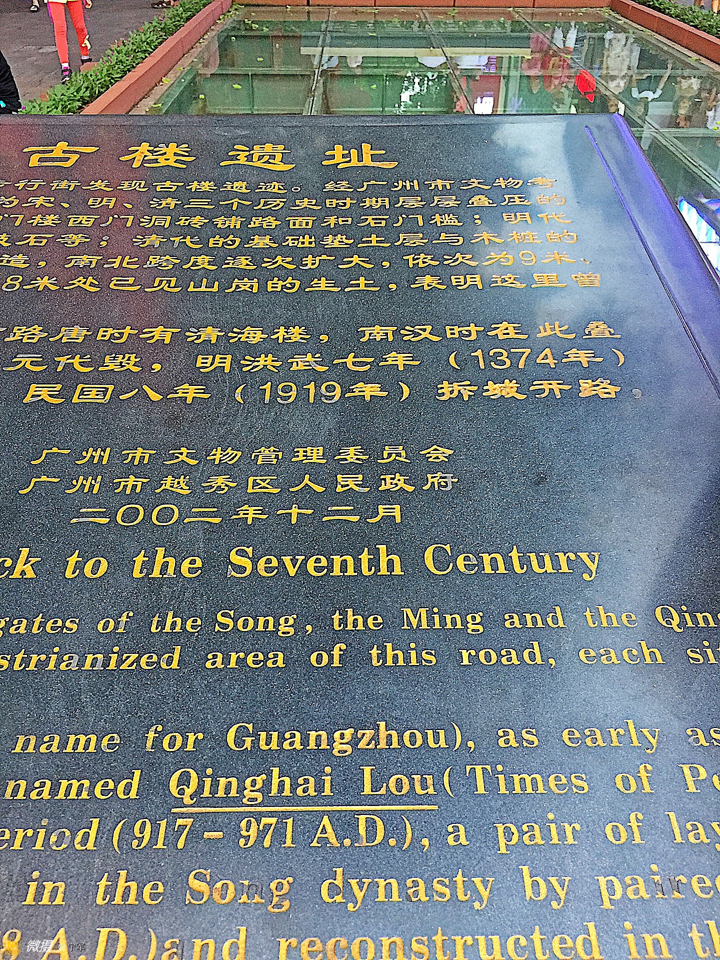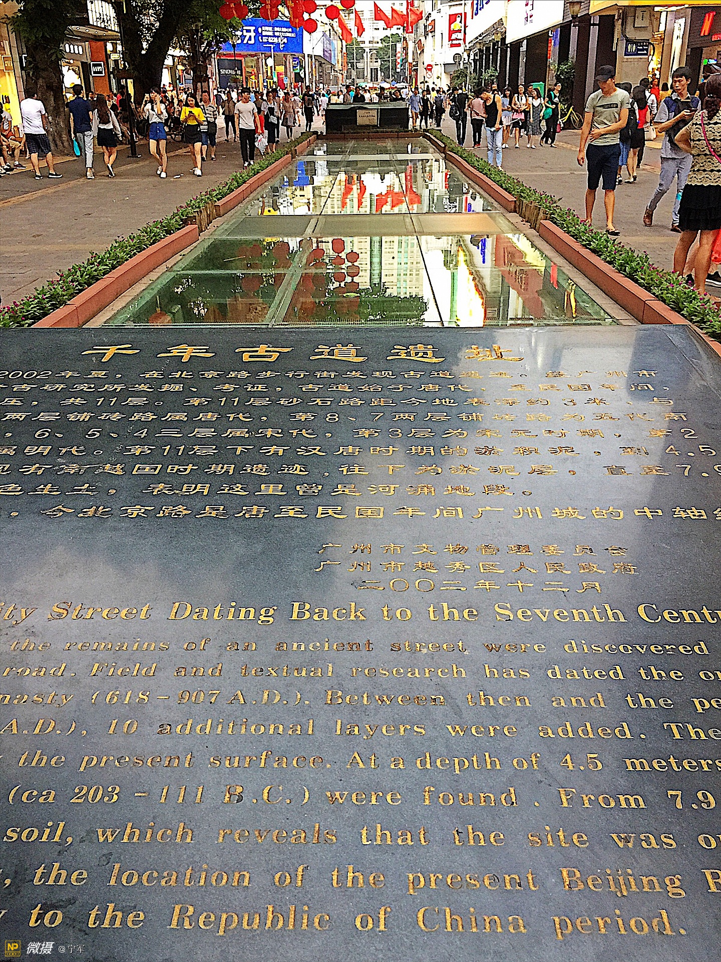 2002年7月初,北京路步行街在整饰工程路面开挖过程中,出土了大量砂岩石条与古城墙砖。经过两个多月的抢救性挖掘,掘出了自南汉以来共五朝11层的路面和宋代拱北楼基址。越秀区有关部门在征询各方意见后,决定用玻璃钢罩覆盖其上向市民展示。这一遗址被称作“千年古道遗址”,并于2003年1月正式开放。这一新发现使得北京路的自古以来就作为商业区的文化特色更为显著。