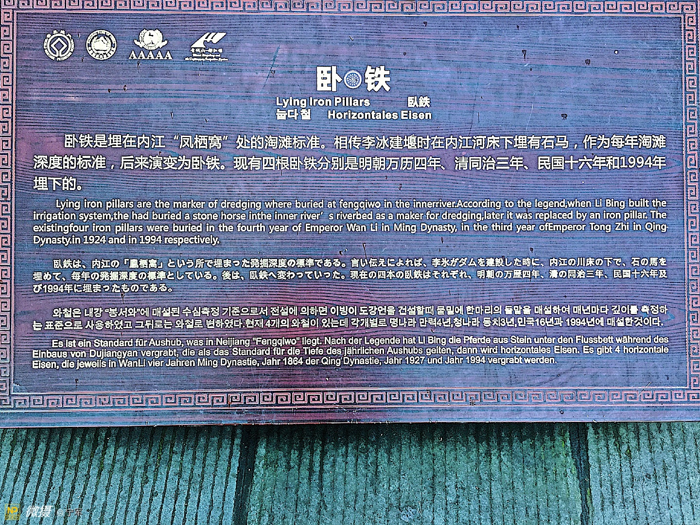 卧铁是埋在内江“凤栖窝”处的淘滩标准,也是内江每年维修清淘河床深浅的标志。相传李冰建堰时在内江河床下埋有石马,作为每年淘滩深度的标准,后来演变为卧铁。现有四根卧铁分别是明朝万历四年、清同治三年、民国十六年和1994年埋下的。游客在离堆古园内喷泉处能看到的这四根卧铁的复制品,其真品还埋在内江河床下。