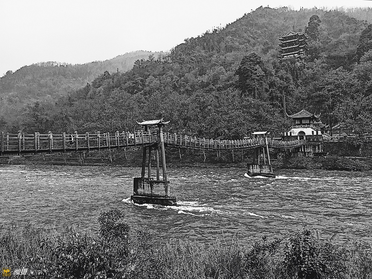 安澜索桥—始建于宋代以前,明末(公元17世纪)毁于战火。古名“珠浦桥”,宋淳化元年改“评事桥”,清嘉庆建新桥更名为“安澜桥”。