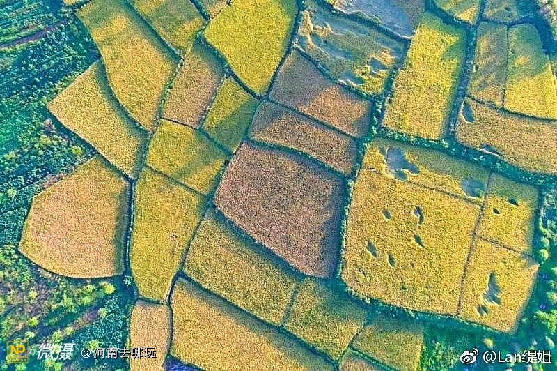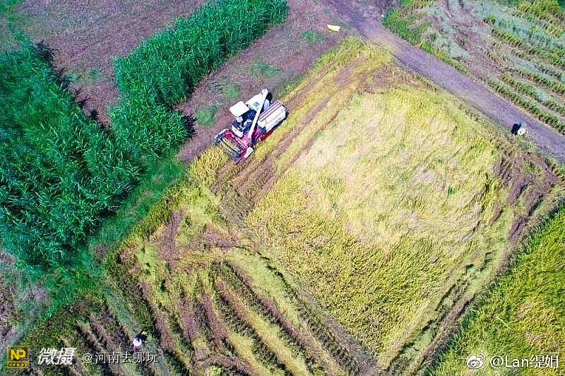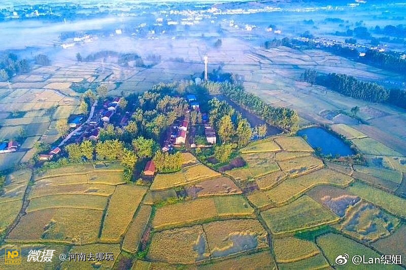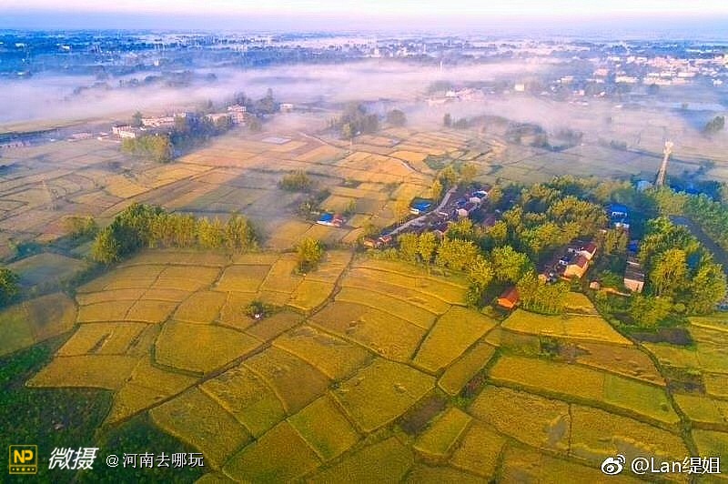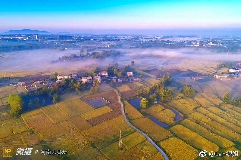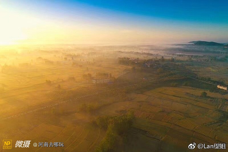 金色九月,收获的季节,今日正值白露,秋高气爽,雨后初晴,金色的田野里出现了难得一见的平流雾,村民们也都在忙碌着。