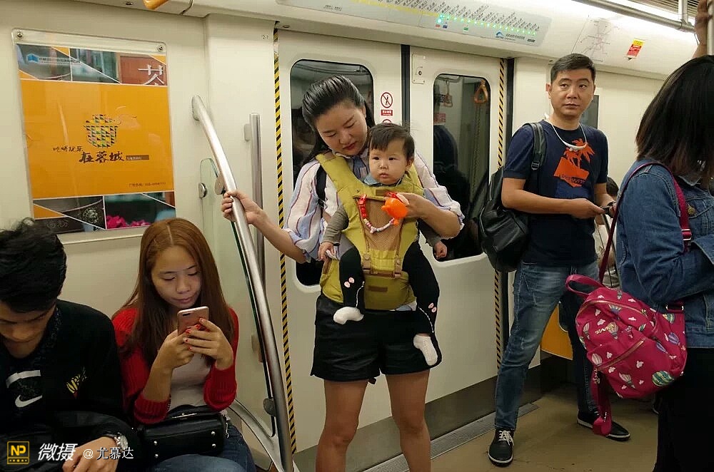 5.地铁上一妇女怀抱孩子站立在车厢里