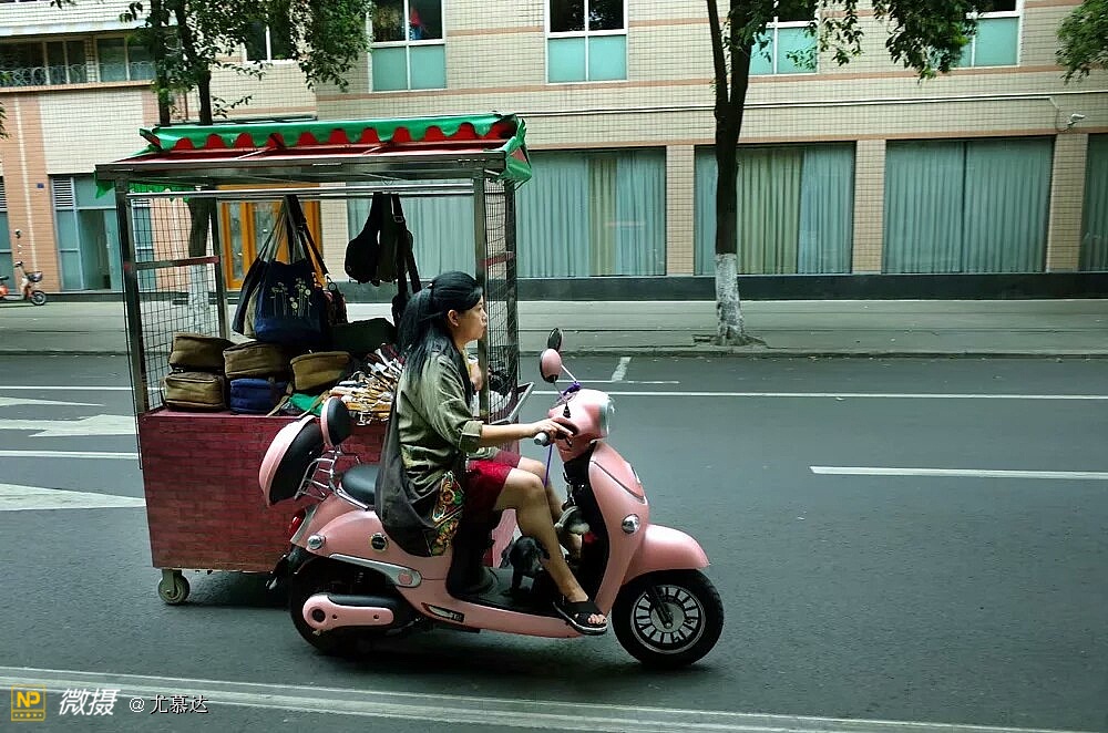 28.骑电动车的妇女另一只手拉住卖货车前行