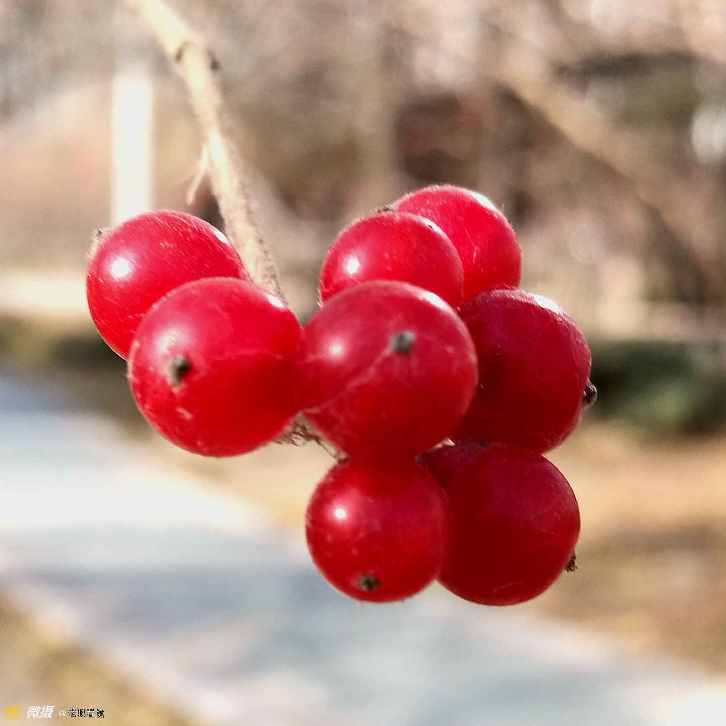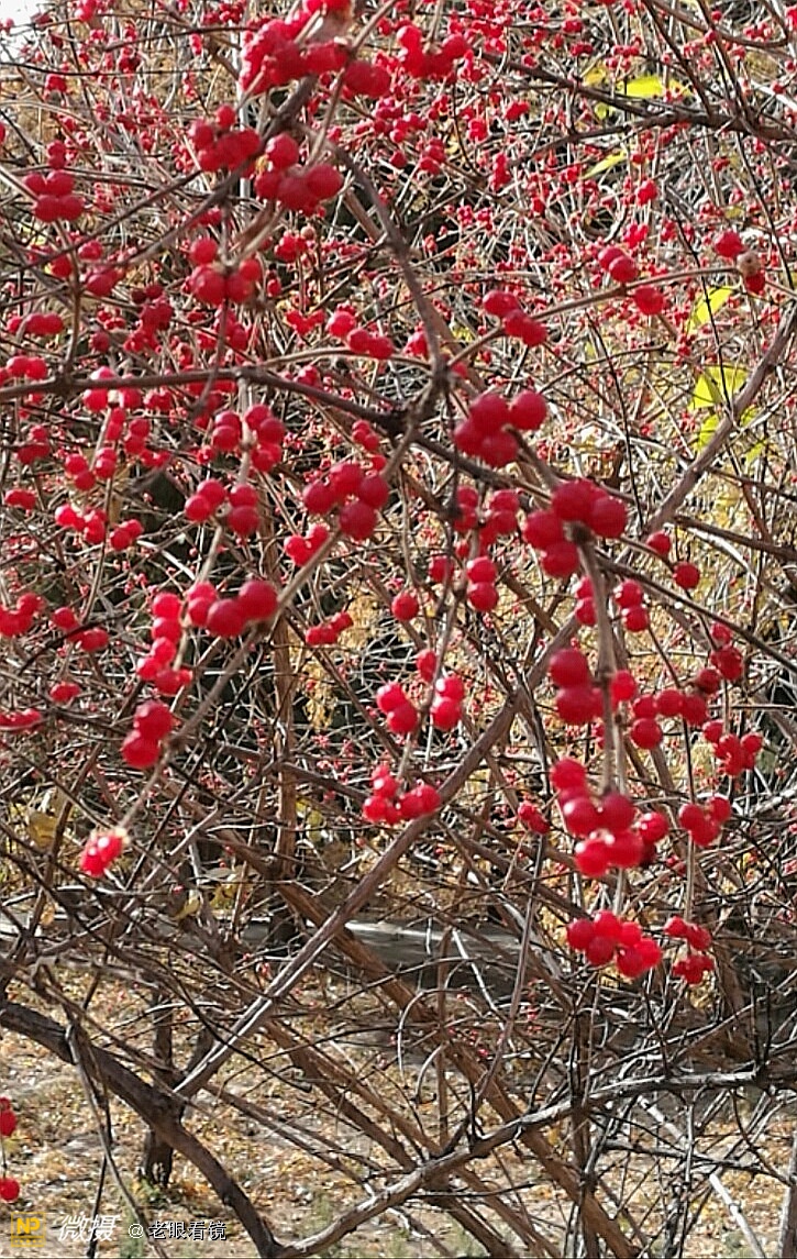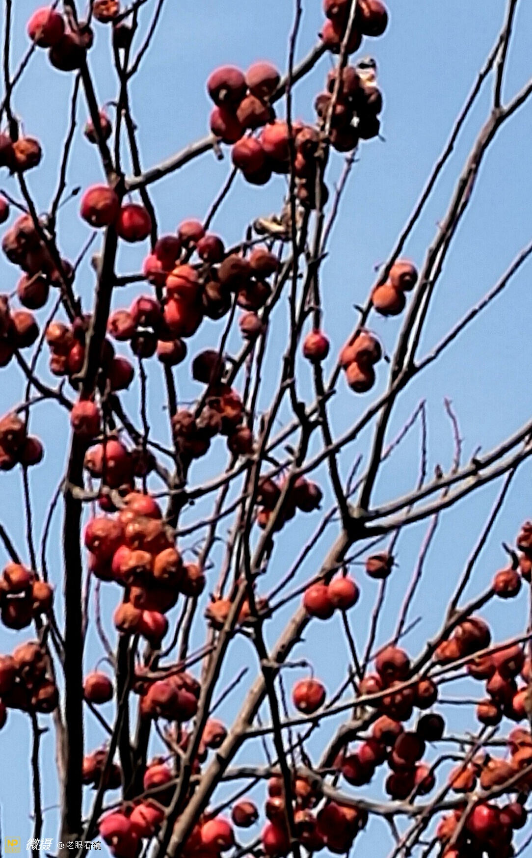 这是什么果实不知道,只觉得在蓝天的衬映下,枯萎的树枝上挂着红红的硕果,色彩着实令人喜欢。