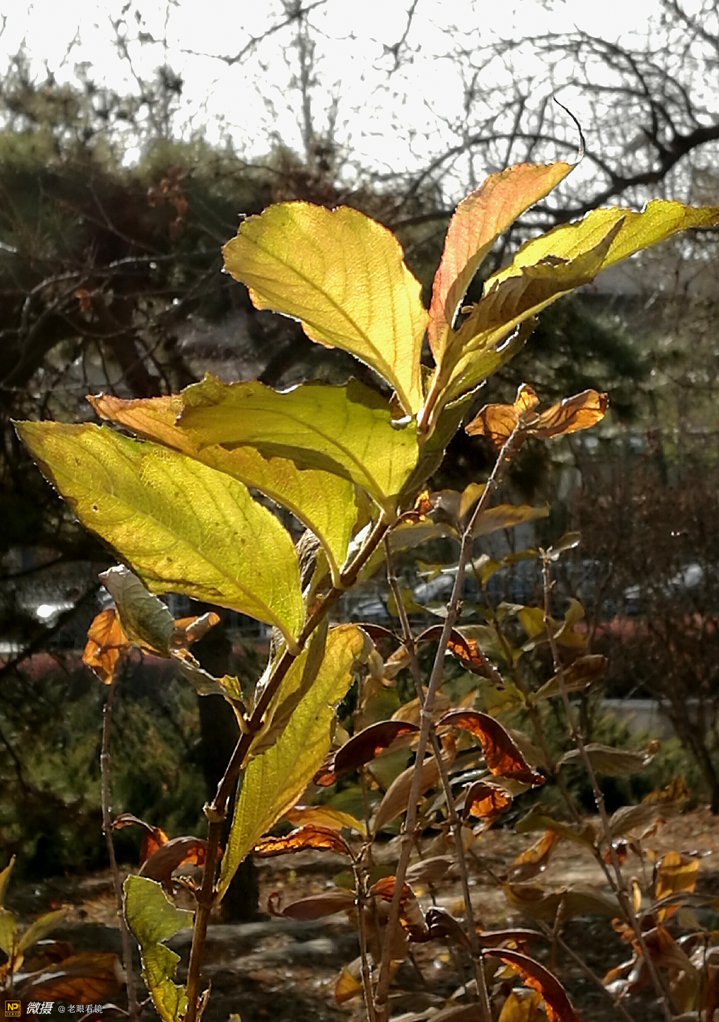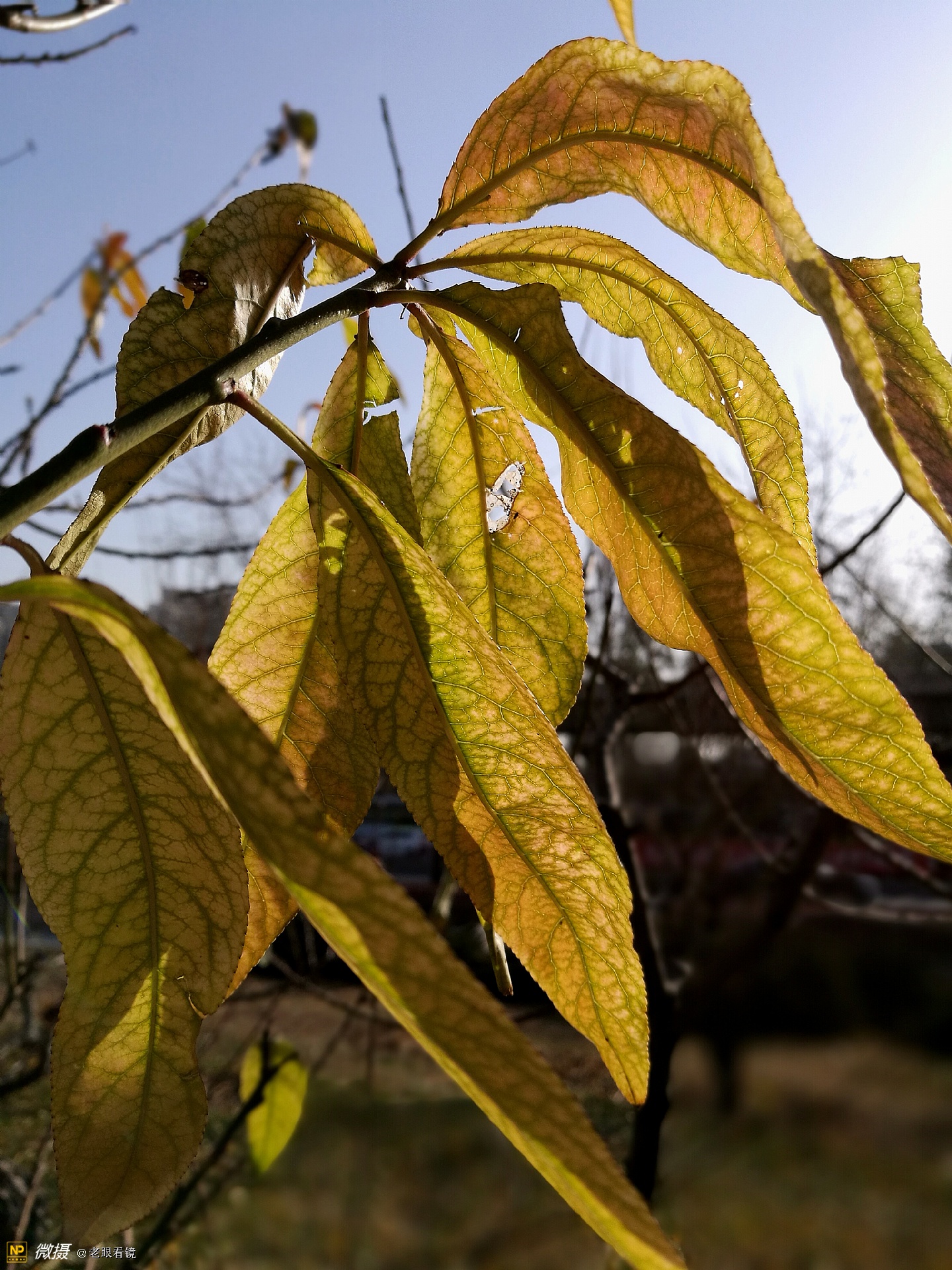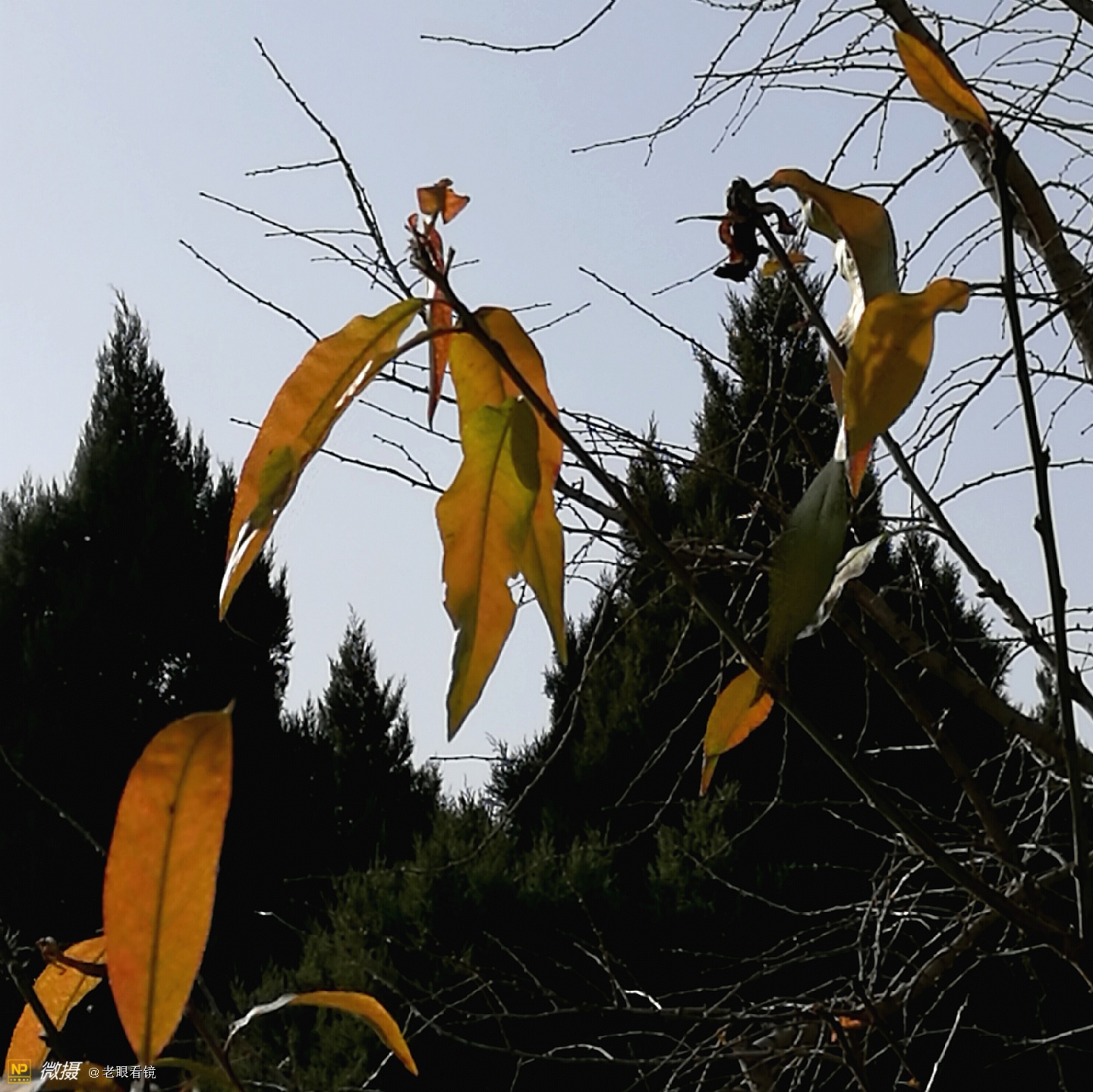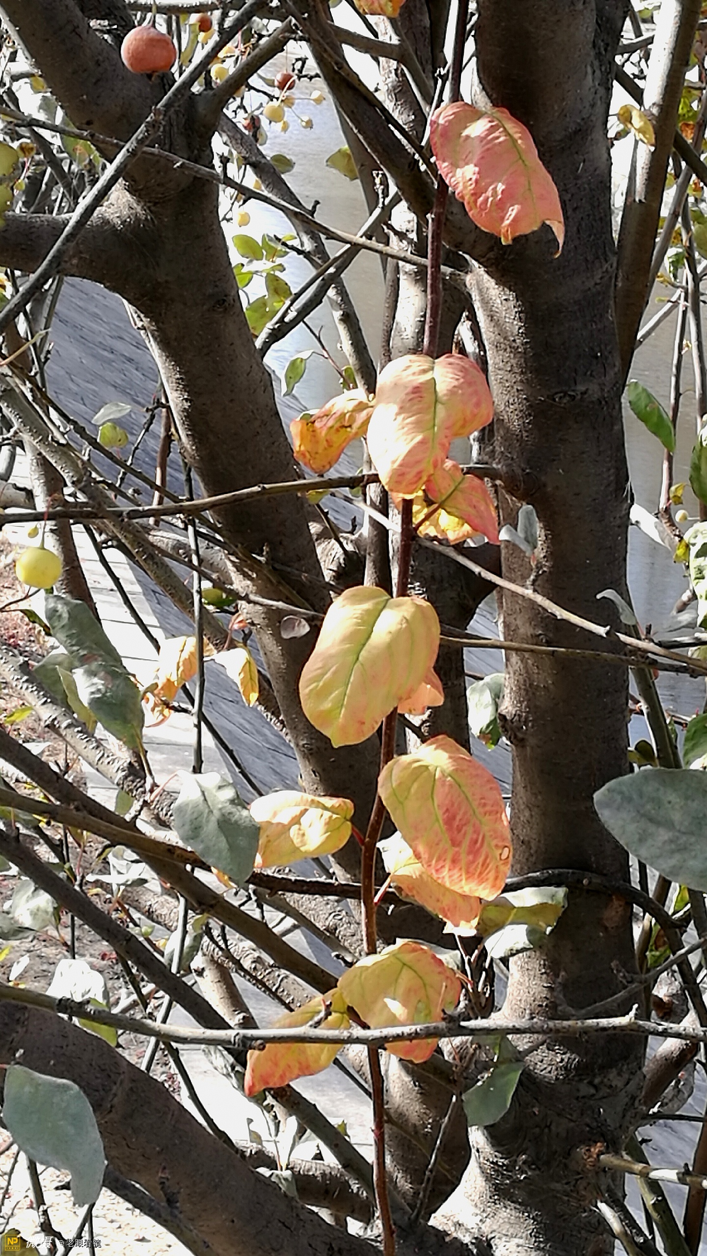 虽然绝大多数的树叶都已经落了,但是这几片不甘离去的叶子,仍然挂在树上,也甚是招人喜欢。