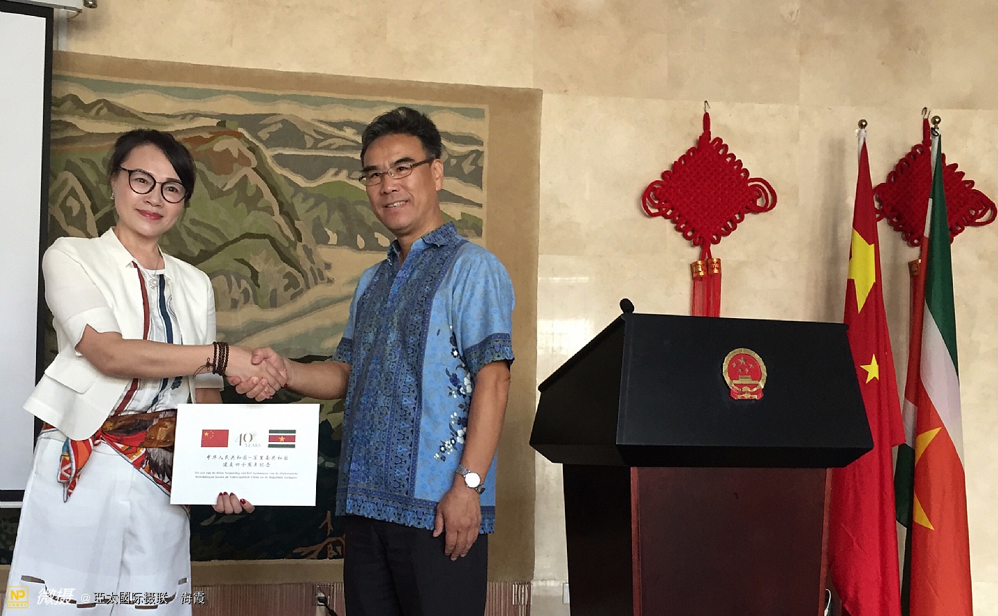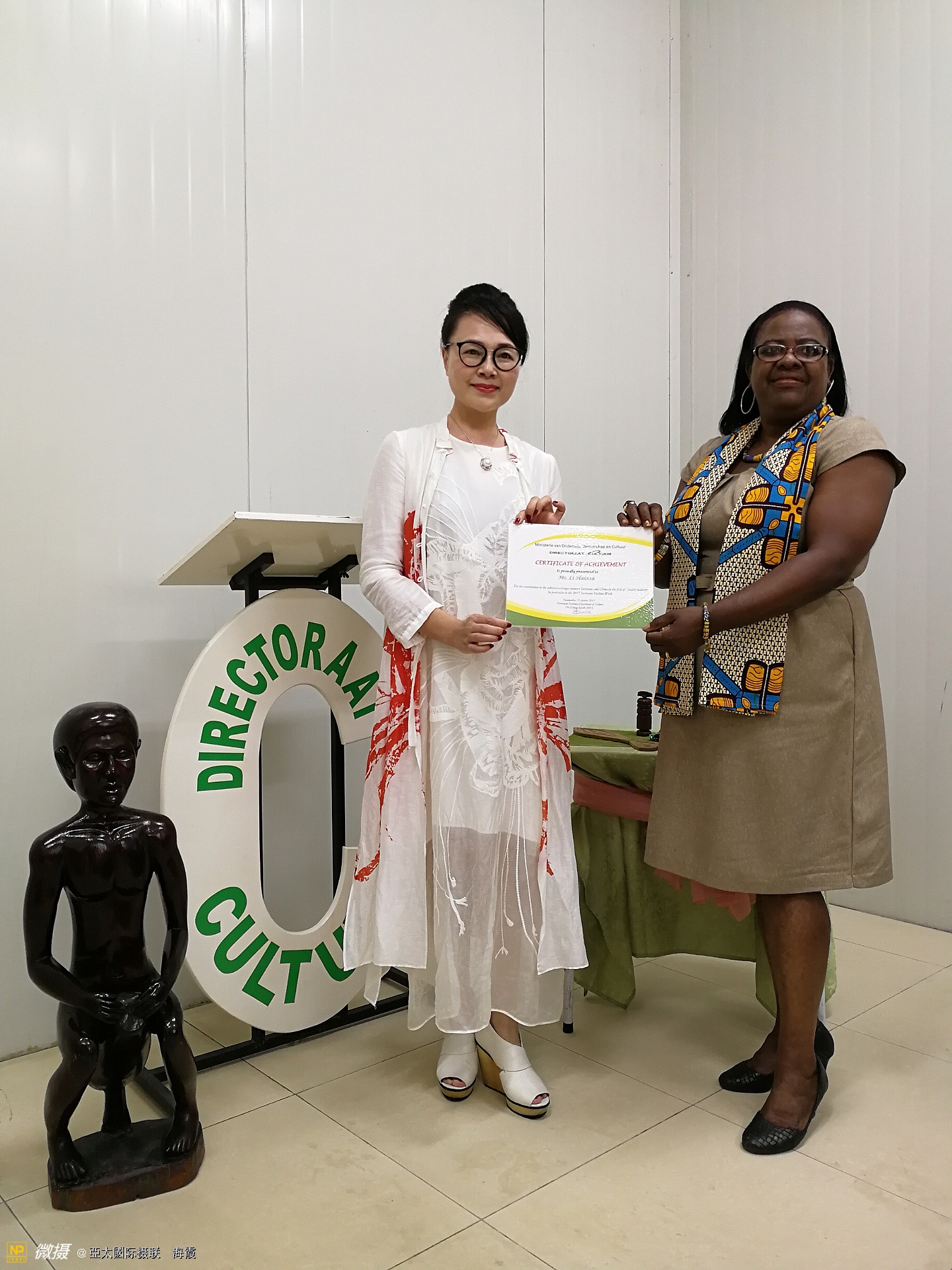 這是蘇里南文化部長親自給我颁發的文化交流大使奖