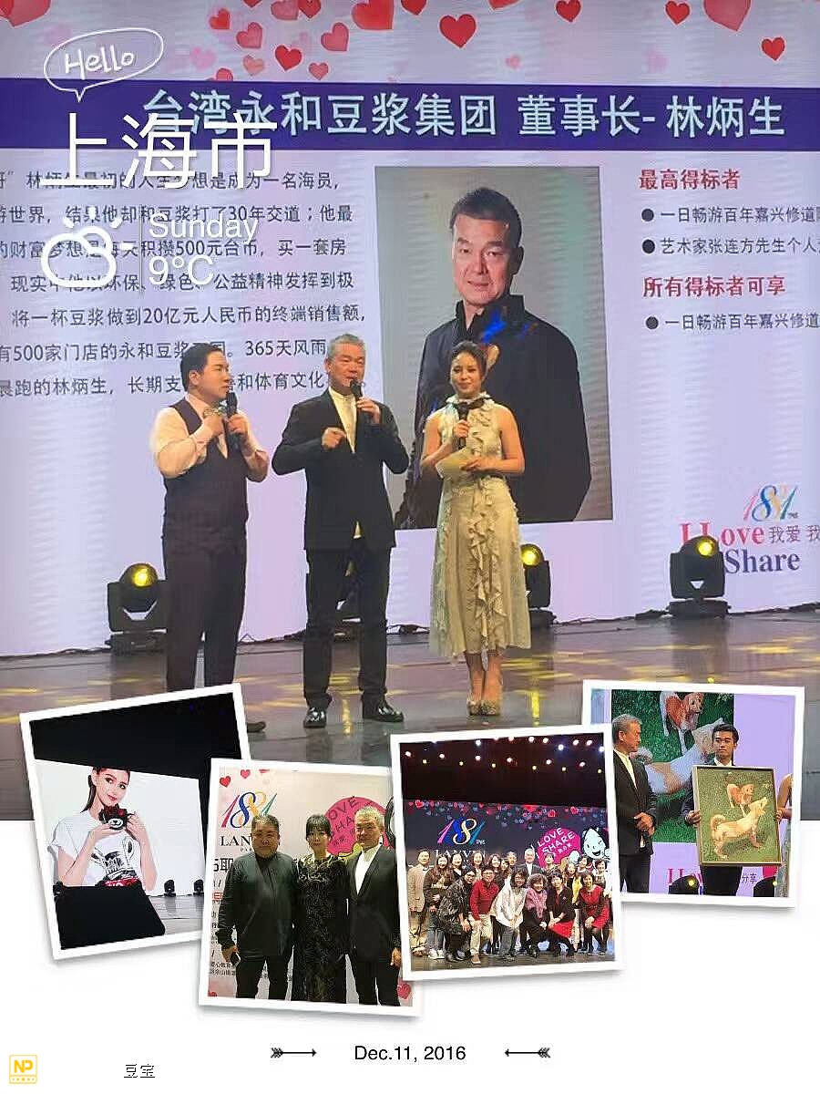 上海,永和豆浆协办1881慈善派对,现场以义拍的形式为保护动物募集资金,永和豆浆奉献出永和文化大使著名油画家张连方老师抢救小狗的油画,及董事长林炳生私人收藏画作,共获拍20餘万元的愛心款,为保护动物而努力!