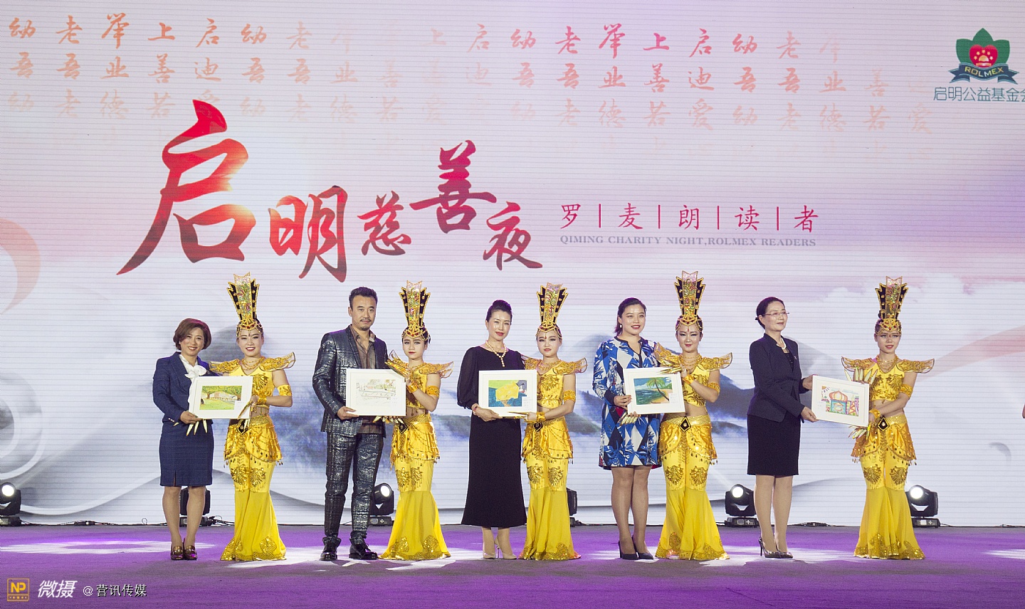 S42:启明慈善夜•罗麦朗读者大型晚会在三亚温情举办,启明公益基金会理事接受残障儿童的赠礼。