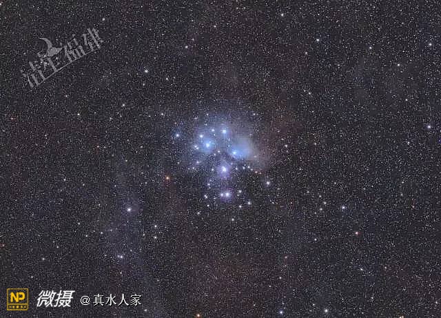 七仙女 今天来点不一样的星空照片。这是我们平时用肉眼无法看这么清楚的深空摄影作品。这究竟是什么星星呢?原来是我们熟知的“七仙女”。“七仙女”就是昴星团(Pleiades,简称M45),是疏散星团之一。在北半球看,它是位于西方大而明亮的疏散星团,位于金牛座,在晴朗的夜空单用肉眼就可以看到它。它的几个亮星位于昴宿,由此而得名。梅西叶星表编号为 M45,肉眼通常见到有六、七颗亮星,所以又常被称为是七姊妹星团。它是离我们最近、也是最亮的几个疏散星团之一。昴星团总共含有超过3000颗的恒星,它的横宽大约13光年,距离128秒差距(417光年),直径约4秒差距。但是,有时候我们用肉眼来看昴星团“七仙女”的时候,好像就只有六颗,还有一颗呢?自然是下凡嫁到了人间。范石泉(网名:星河天文)时间:2016年11月3日相机:尼康D7100改BCF,三阳135F2赤道仪:信达大星野滤镜:宇隆L-pro导星:QHY迷你套装参数:f2.8-iso1600-300s,24张叠加,暗场、平场、偏置场若干。后期:MaxIm DL叠加,PixInsightLE人工平场,PhotoShop cc拉伸、缩星、饱和度、降噪、最终出图。