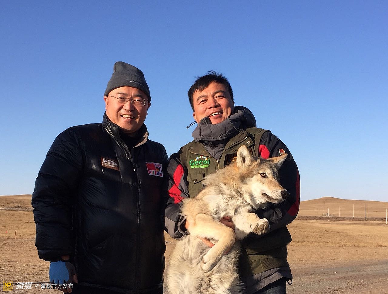 国家摄影主席大河先生(左)和乌珠穆沁野狼谷负责人王忠华先生(右)在一起与一匹可爱的小狼合影。