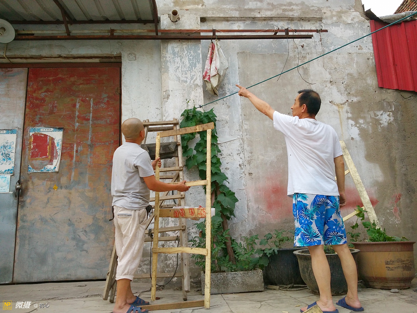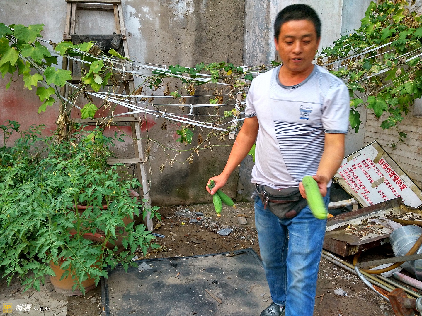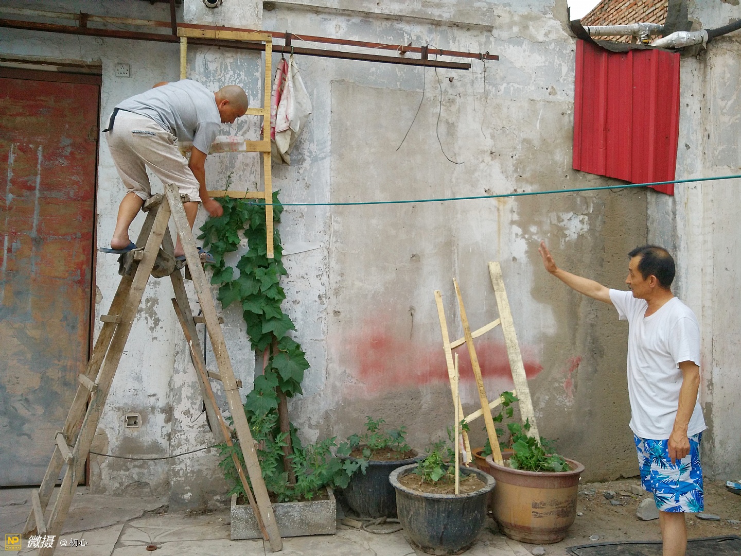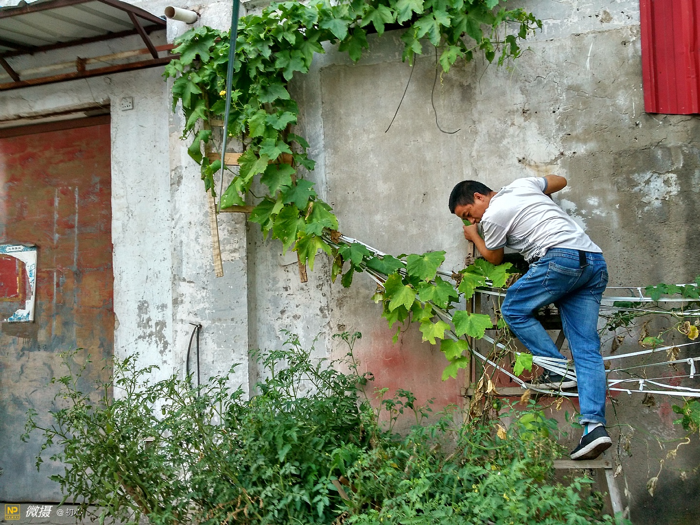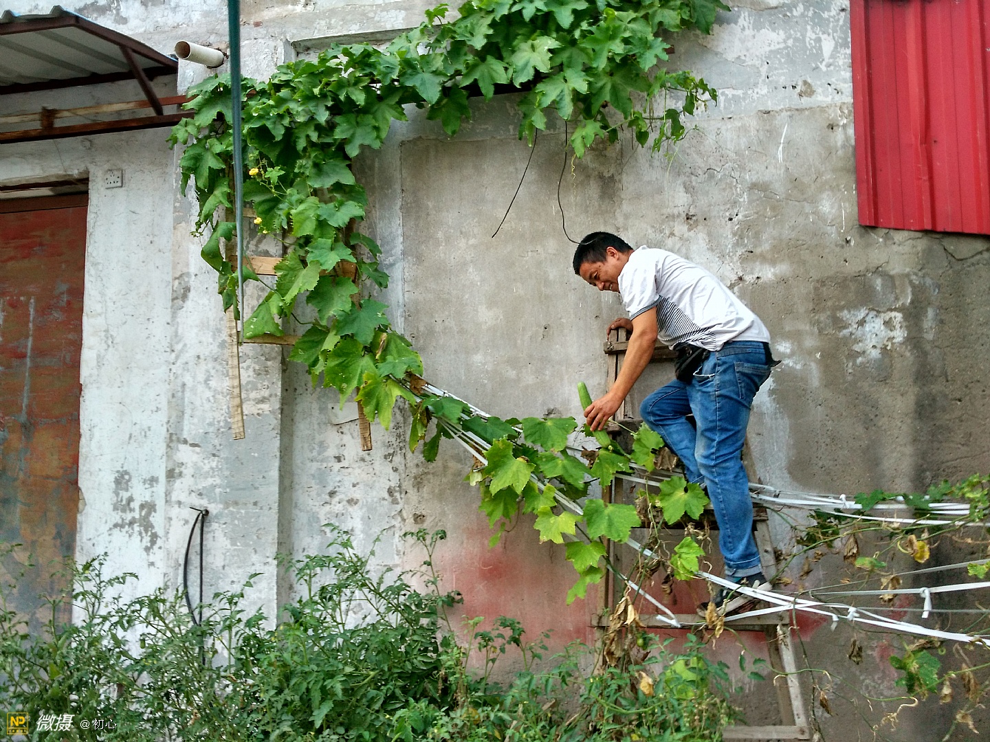 登上梯子上去摘丝瓜的老曹。